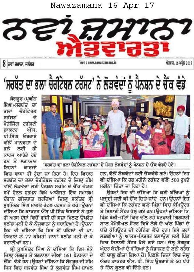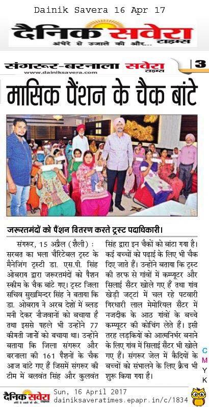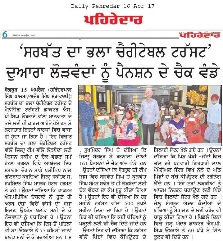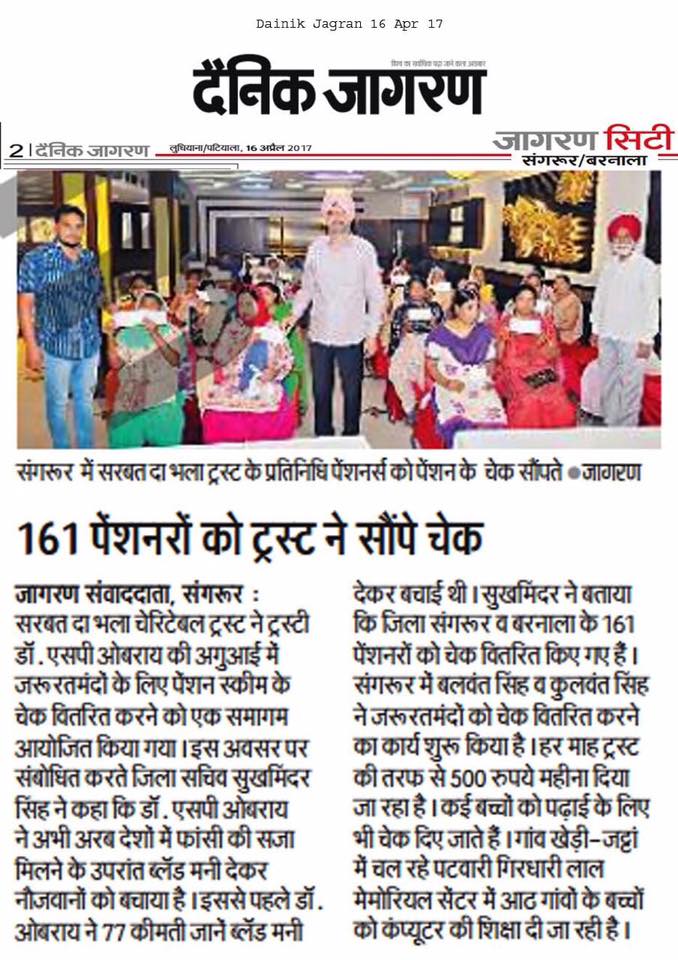 Under the able guidance and leadership of Respected Prof. Dr. S.P Singh Oberoi Sarbat da Bhala Charitable Trust team members of district Sangrur handed over the monthly pensions to 160 Widows and needy ladi