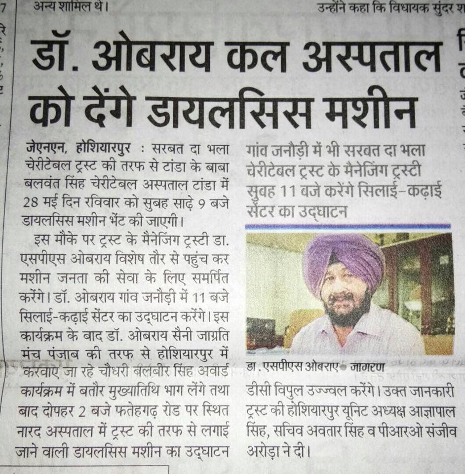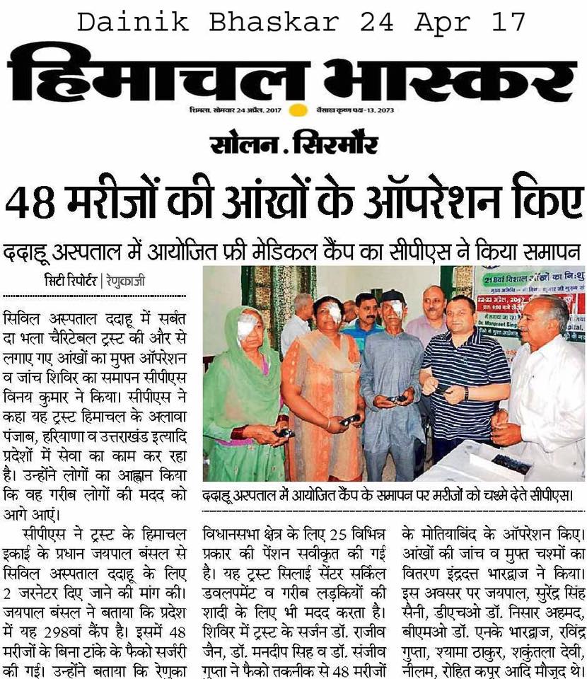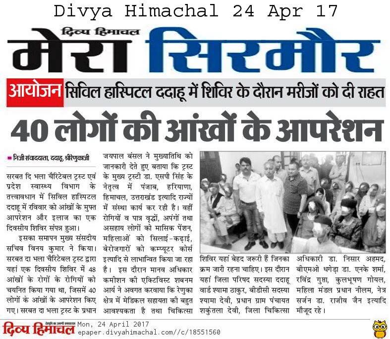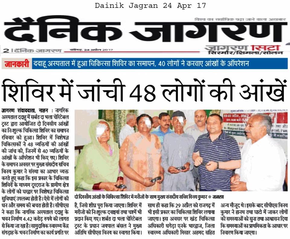 Under the able guidance of Dr. S.P.Singh Oberoi 218 Eye camp was held at Civil Hospital Dadahu . More than 240 were examined and 48 were operated by team of Doctors lead by Dr. Rajeev Jain and Dr. Manpreet Singh Ji