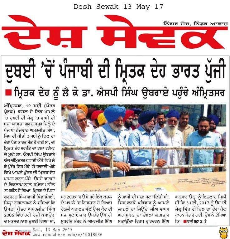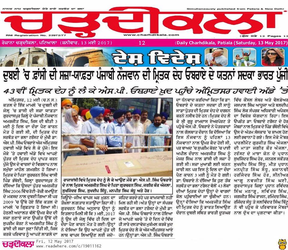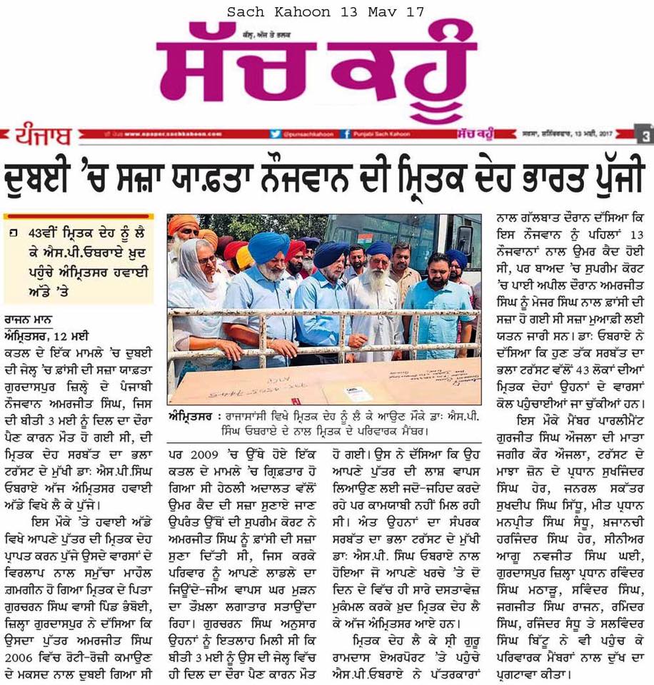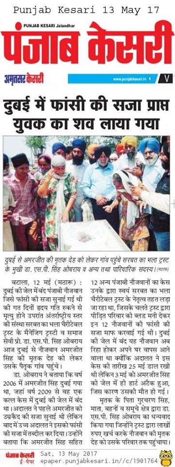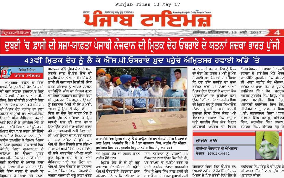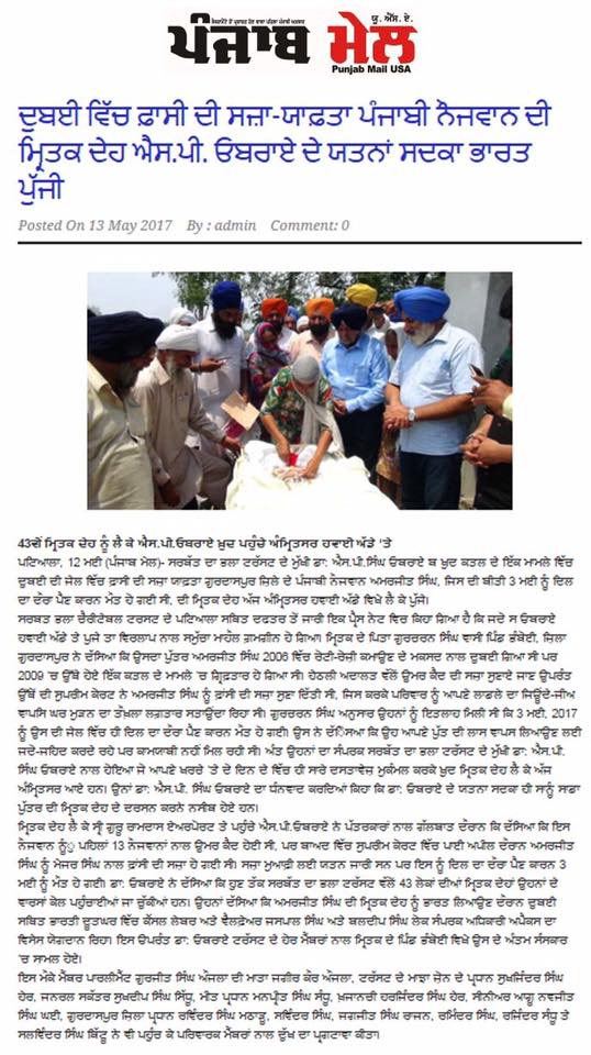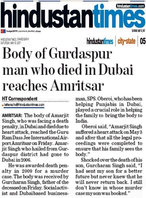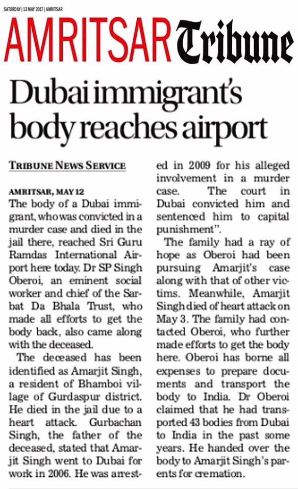 Prof (Dr) S.P.Singh Oberoi brings back the body of Punjab youth who died in Dubai jail
