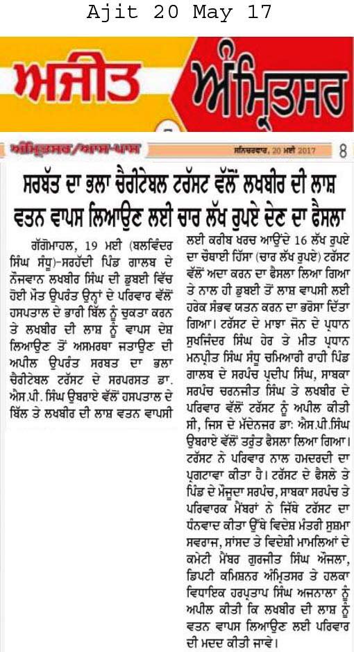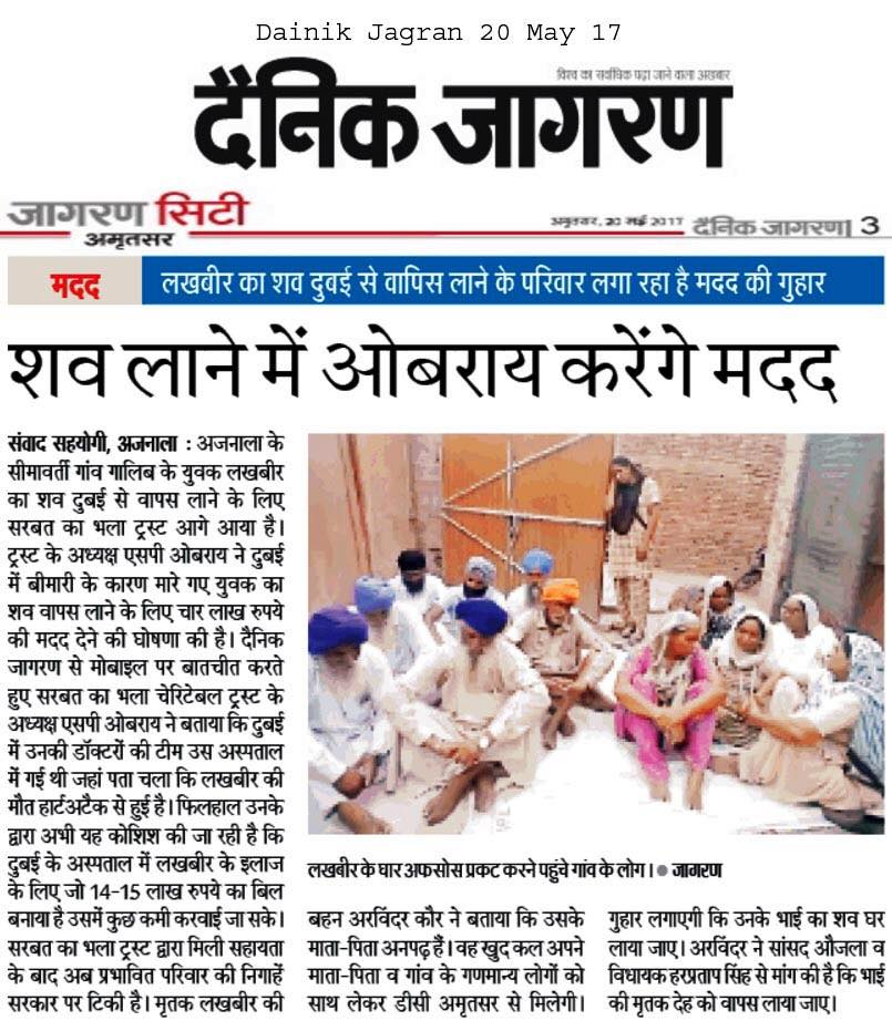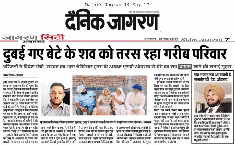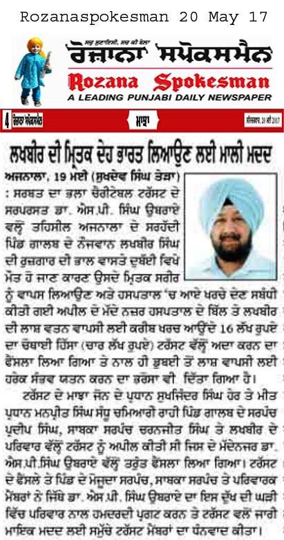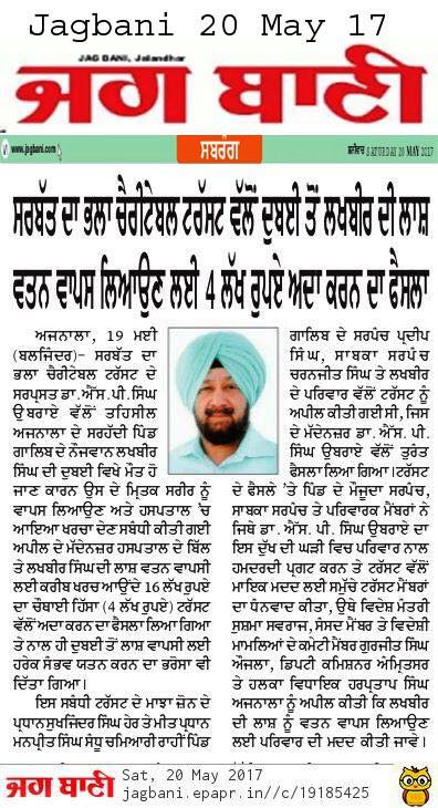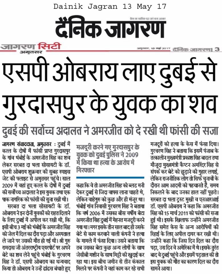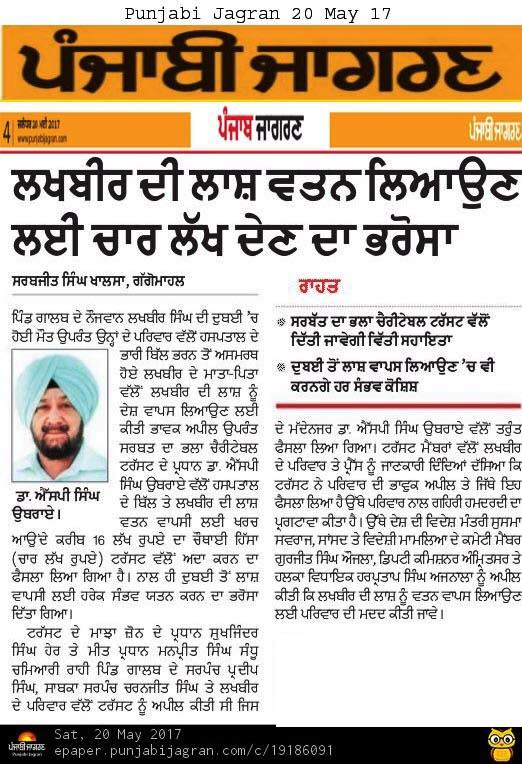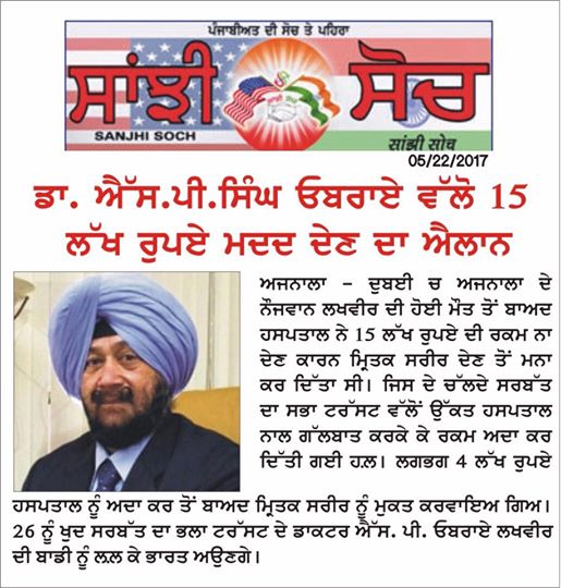 Dr S P Singh Oberoi Ji announced to give Rs 4 lakhs as help to bring the body of person who had been died in Duba