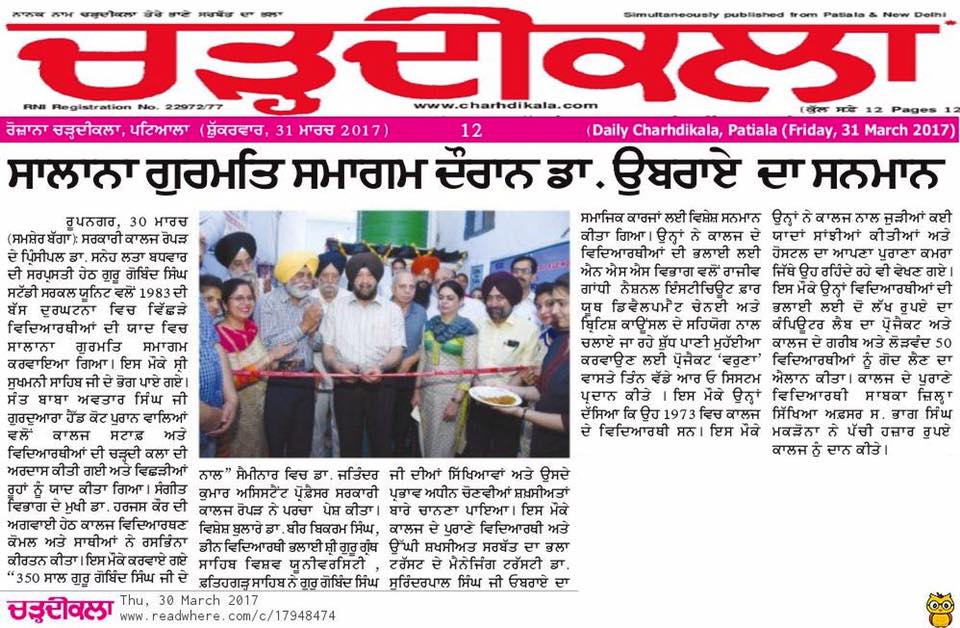 Dr. S.P.Singh Oberoi honored by the Principle Of Government Collage Ropar on the occasion of Gurmat Samagam