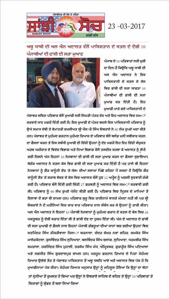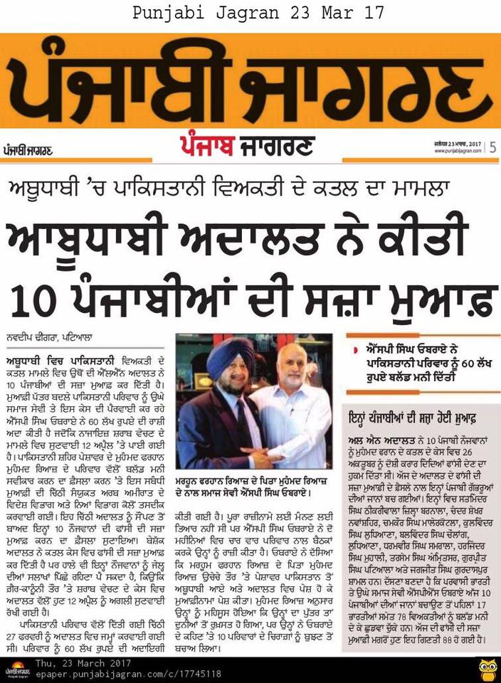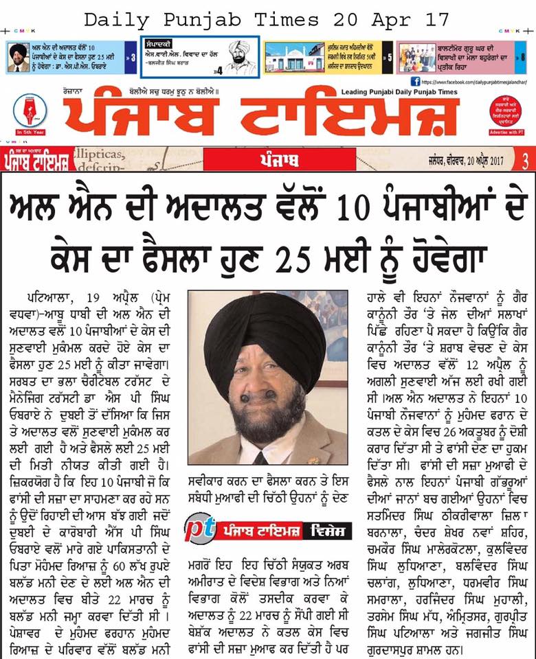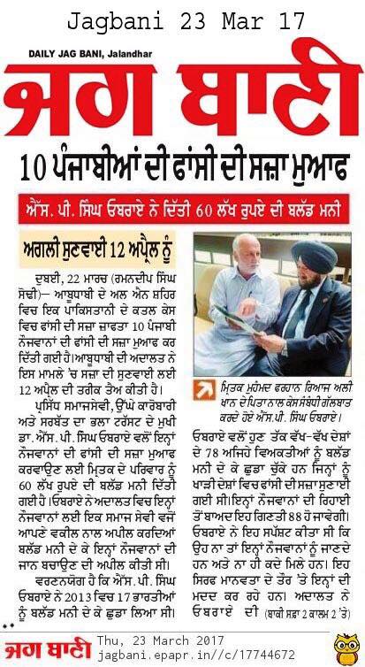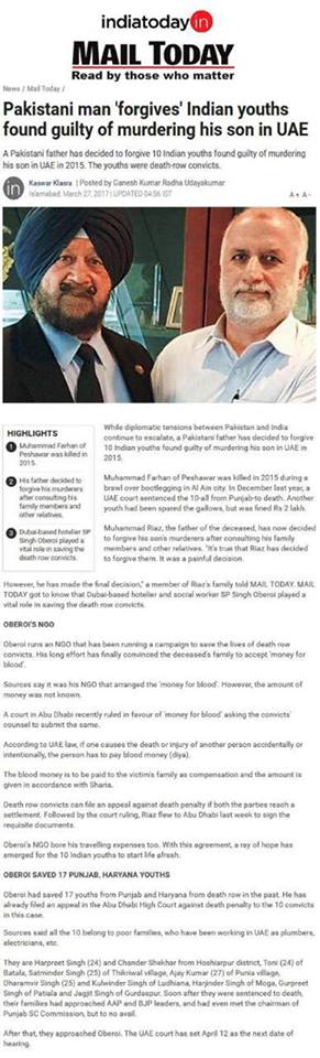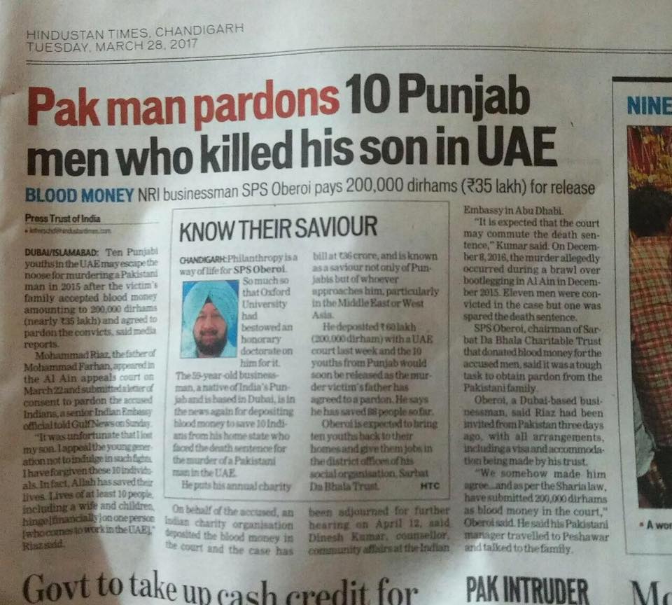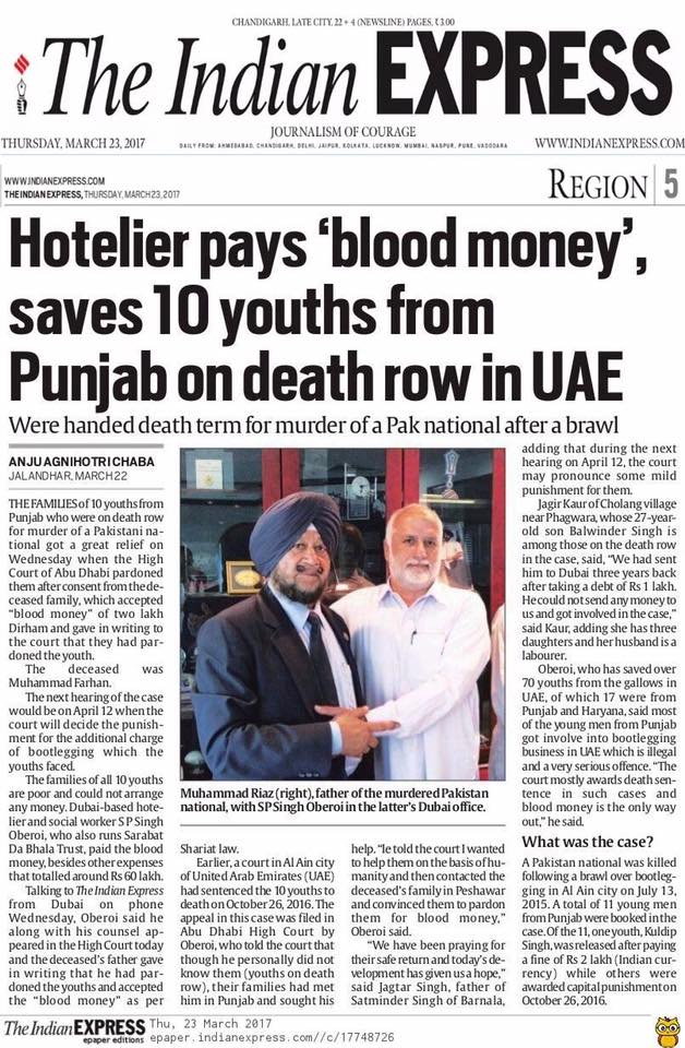 Prof ( Dr ) S P Singh Oberoi Ji paid Blood Money to save 10 youth from Punjab on Death row in UAE