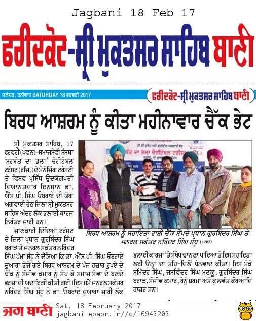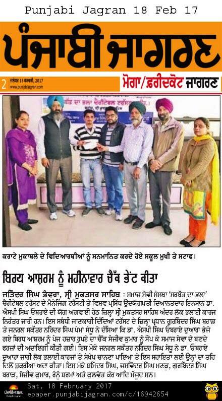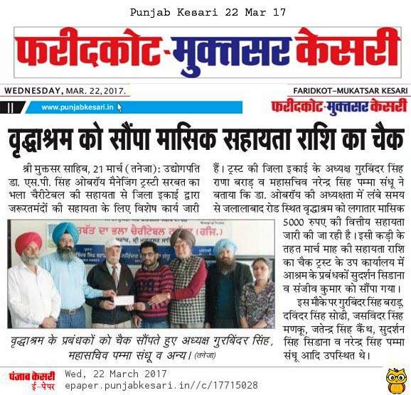 Under the able guidance of Dr. S.P Singh Oberoi Ji Sarbat da Bhala Charitable Trust team members of Shri Muktsar Sahib hand over the cheque of monthly support to Old Age Home