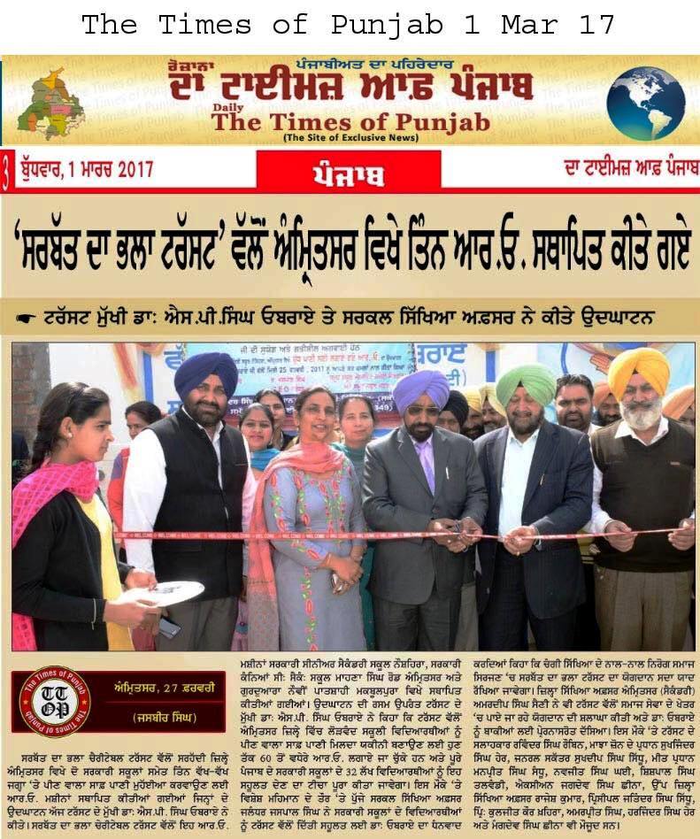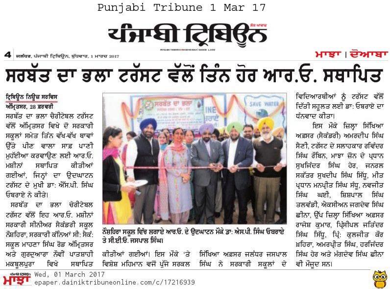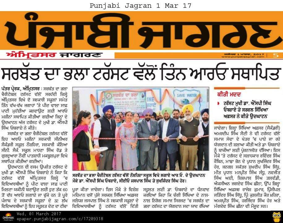 Sarbat da Bhala Charitable Trust installed R-O system at Govt Sen Sec School (girls) Mahana Singh Road , Amritsar