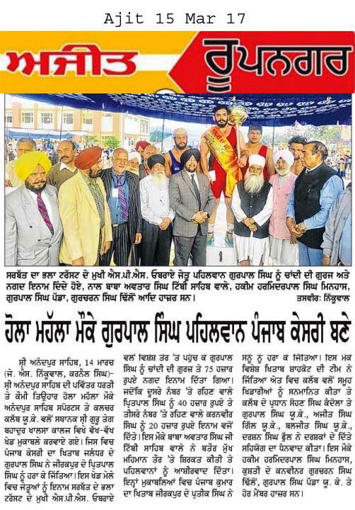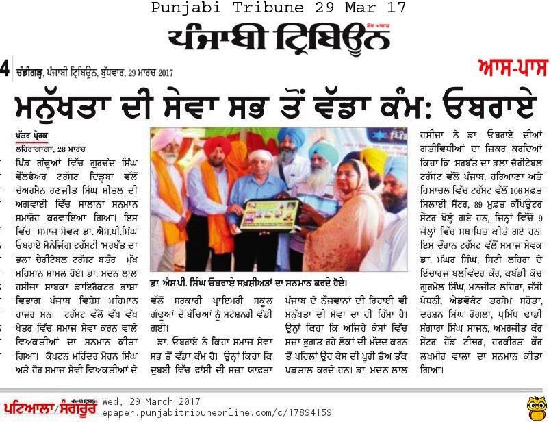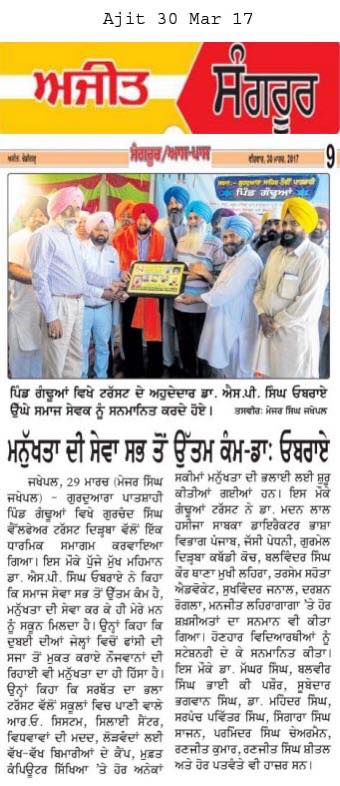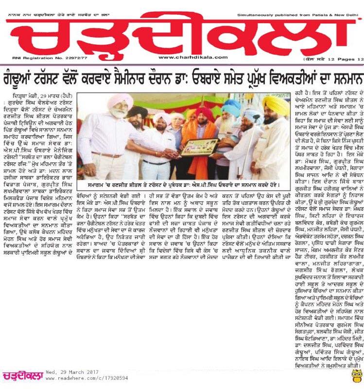 Dr. S.P.Singh Oberoi honored by Gurchand Singh welfare trust at village Gandua, Dist. Sangrur.