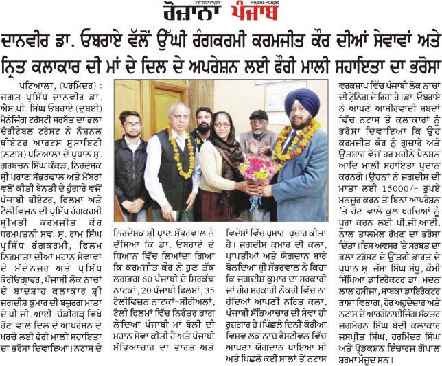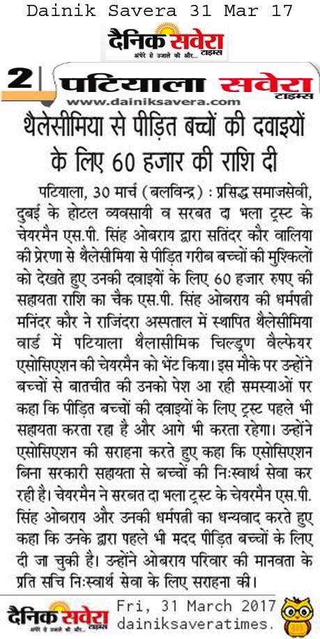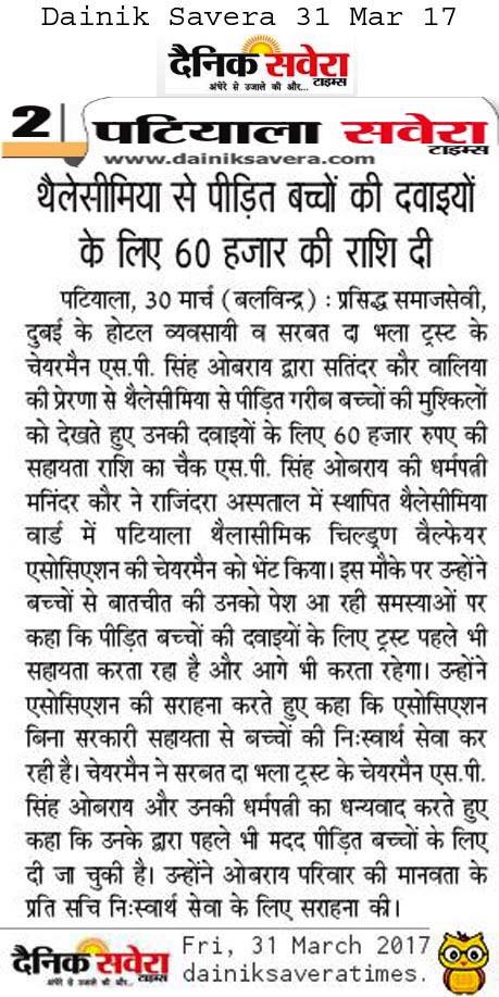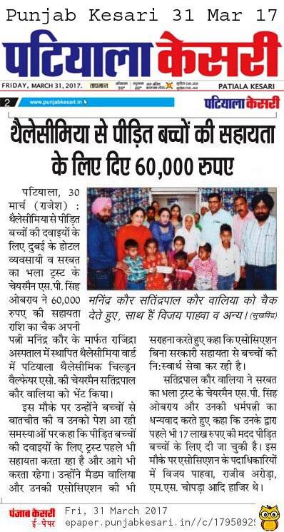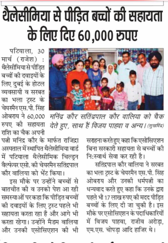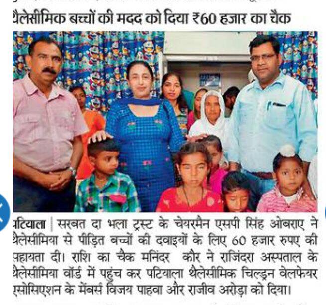 Sarbat da Bhala Charitable Trust is providing monthly support to Rajendra Hospital Patiala for the treatment of needy child suffering from Thalassemia. Mrs Oberoi handed over the cheque to the Hospital authorities