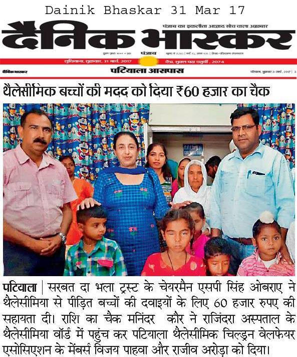 Sarbat da Bhala Charitable Trust is providing monthly support to Rajendra Hospital Patiala for the treatment of needy child suffering from Thalassemia