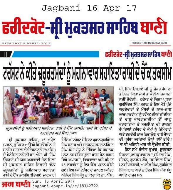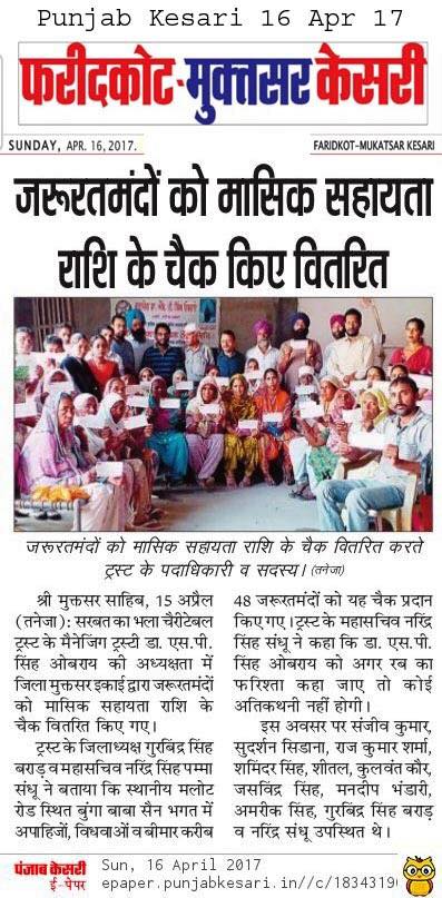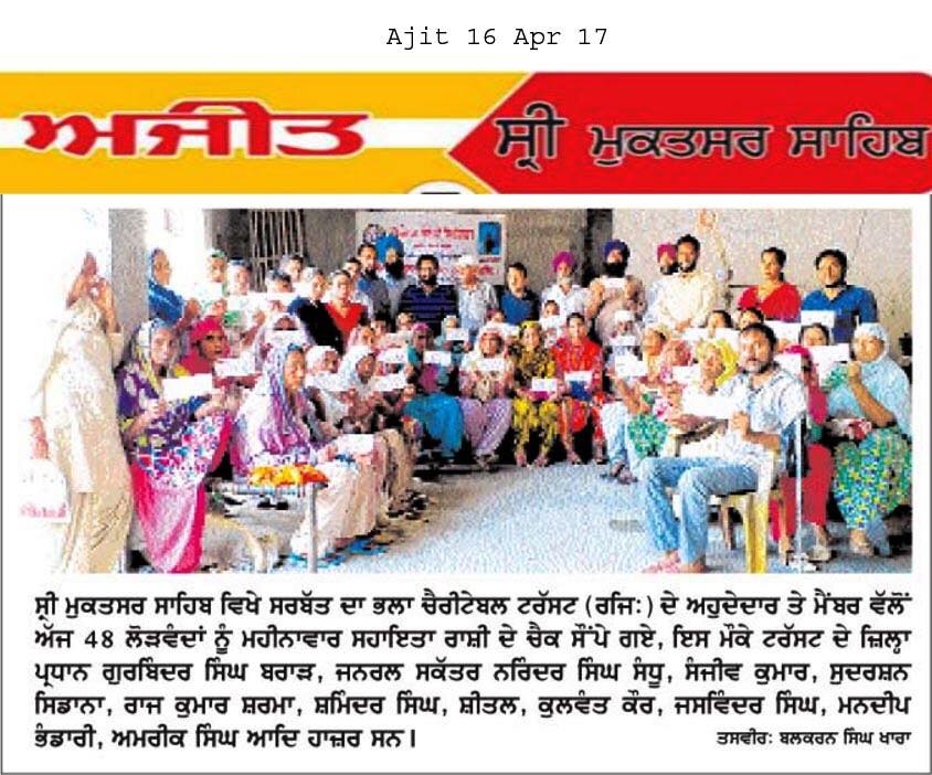 Under the able guidance and leadership of Prof. Dr. S.P Singh Oberoi Sarbat Da Bhala Charitable Trust team members of Sri Muktsar Sahib handed over the monthly pension cheques to 48 widow ladies and needy ones at Bunga baba sain bhagat