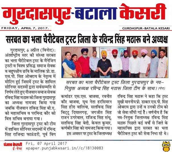 Prof ( Dr) S P Singh Oberoi Ji appointed Mr. Harvinder Singh Matharoo as president of SDBCT Gurdaspur Unit.