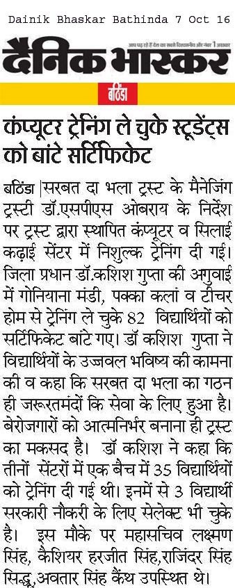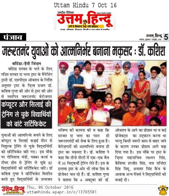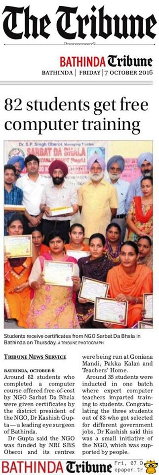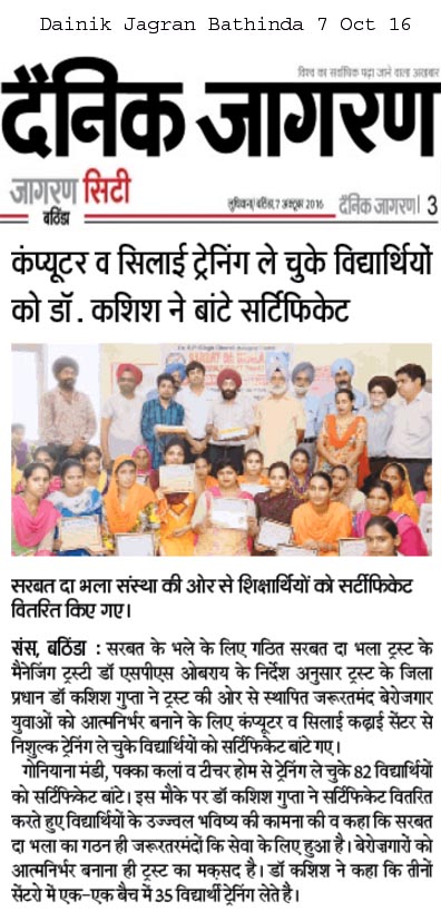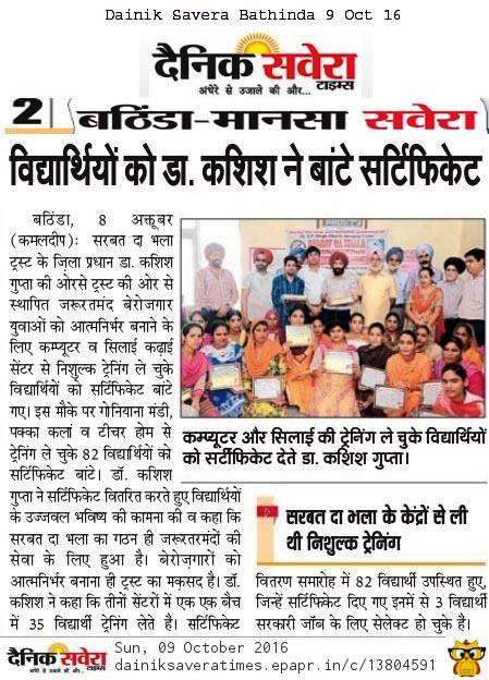 Sarbat Da Bhala Charitable Trust students of Sewing Center & computers Bathinda center successfully completed their courses