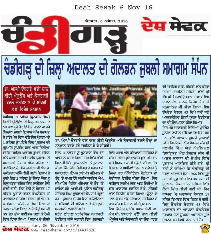 Prof. (Dr) S P Singh Oberoi been honoured by H'ble Mr Justice A K Sikri ( Supreme Court) & Chief Justice H'nble Shivax Jal Vazifdar