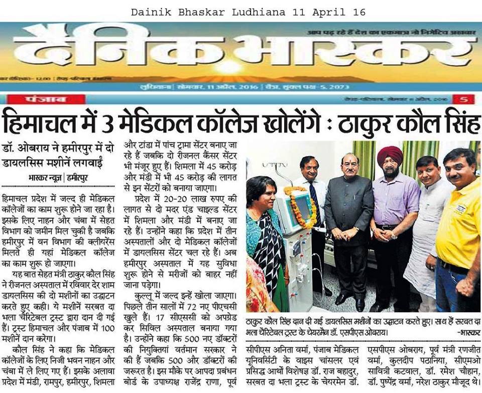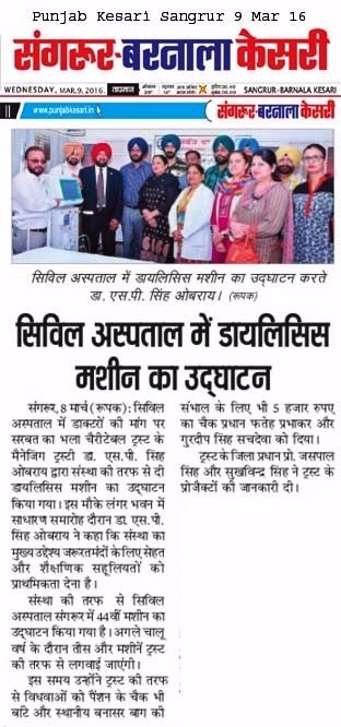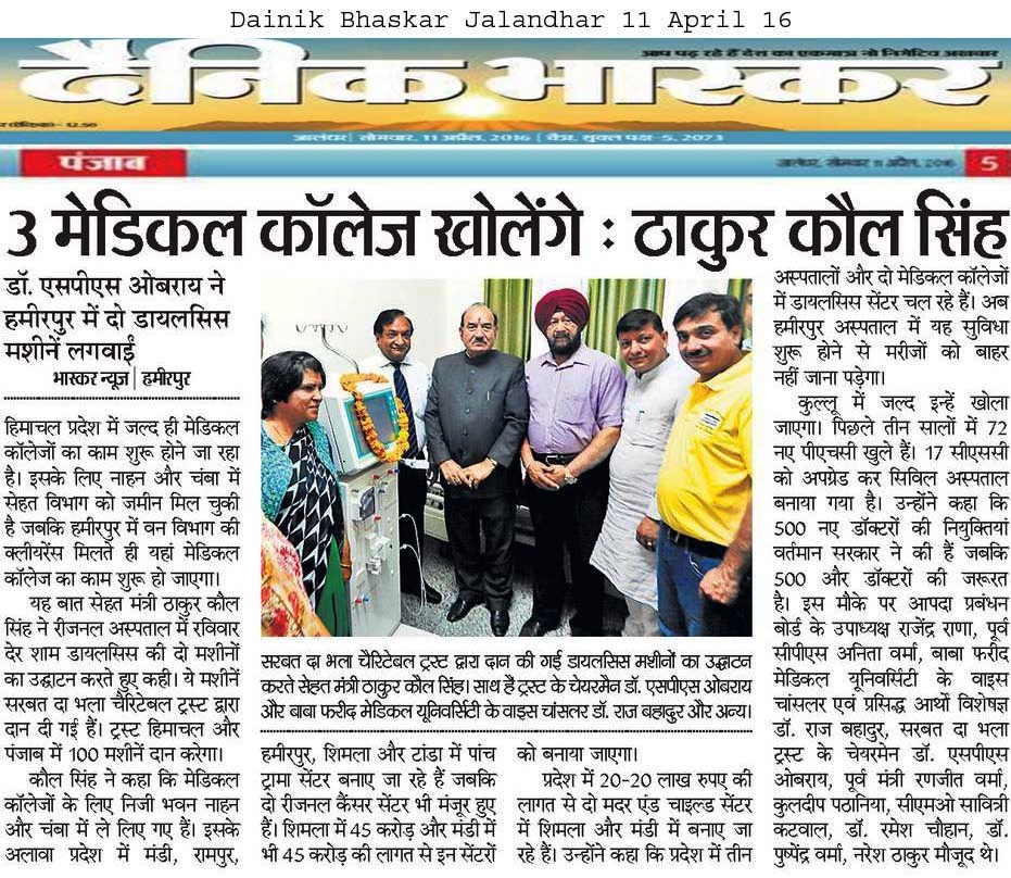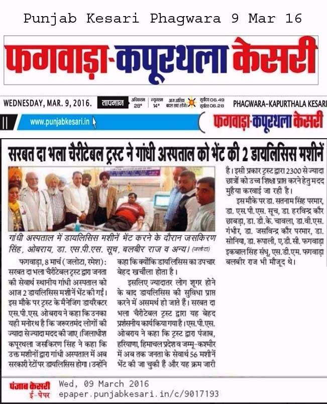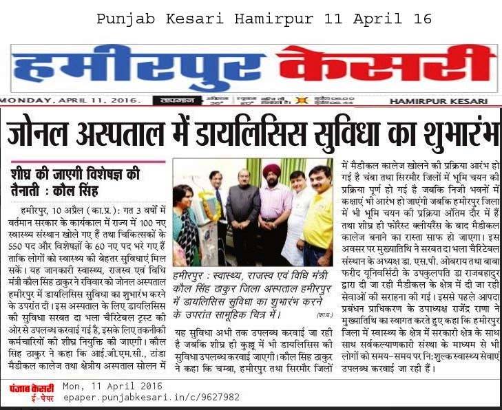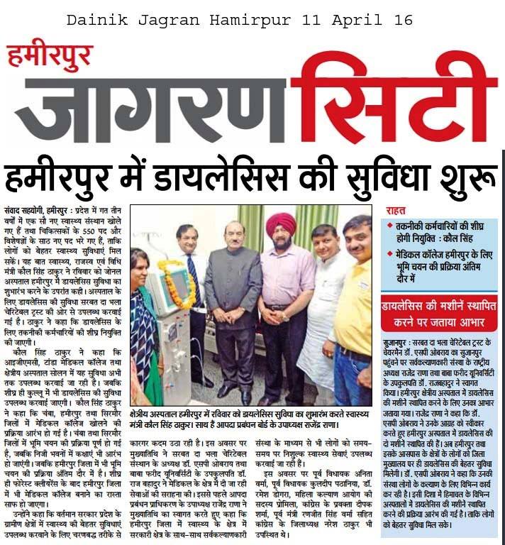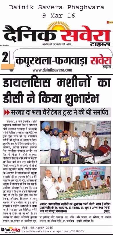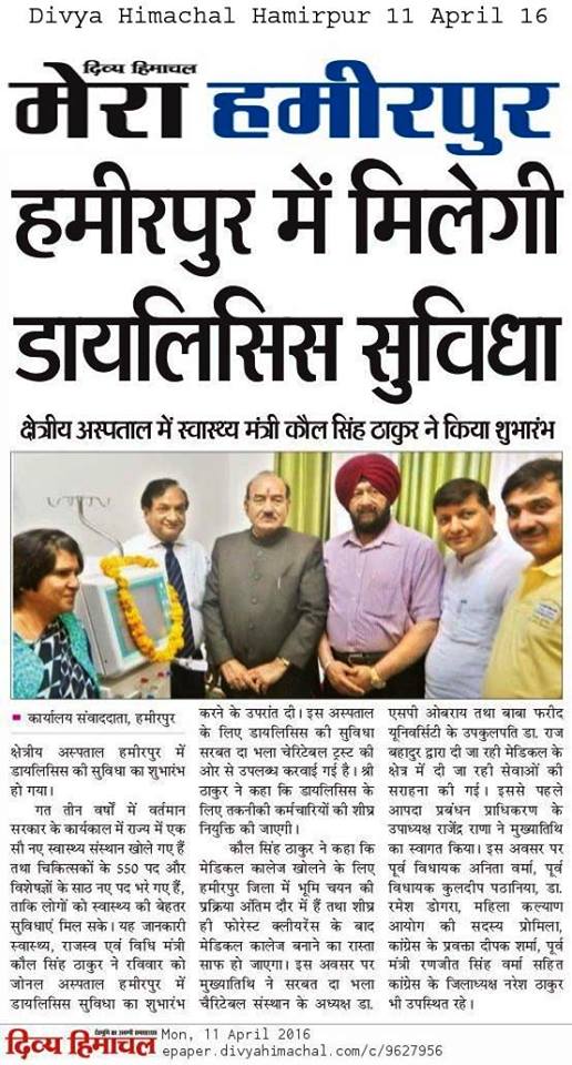 Sarbat Da Bhala Charitable Trust donated Dialysis Wing (2 no's Dialysis Units with complete RO system ) in Civil Hospital Hamirpur
