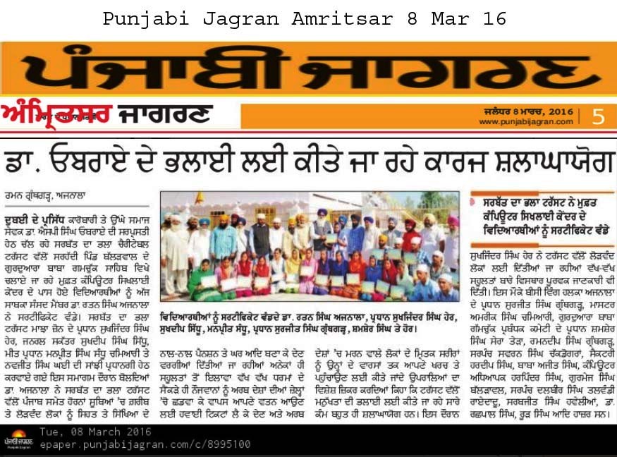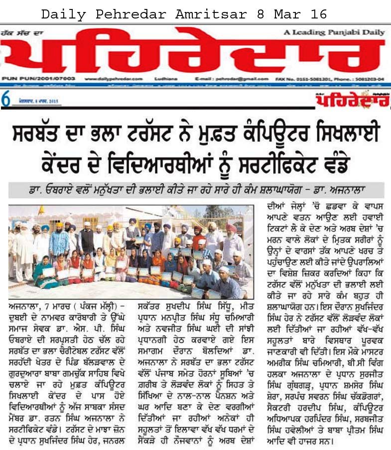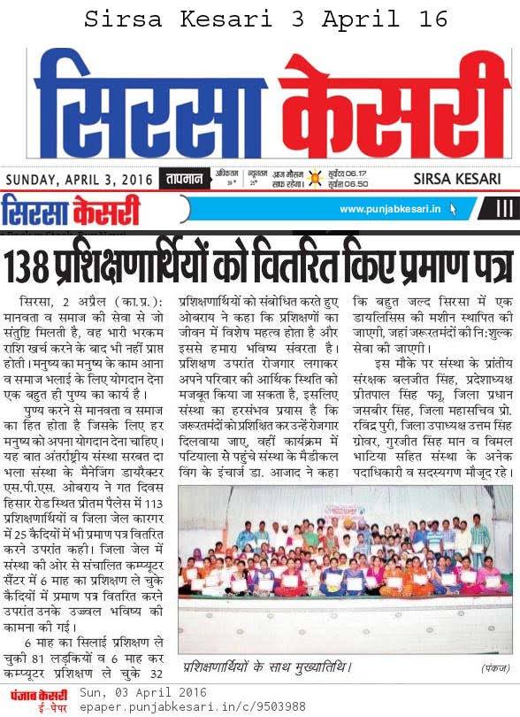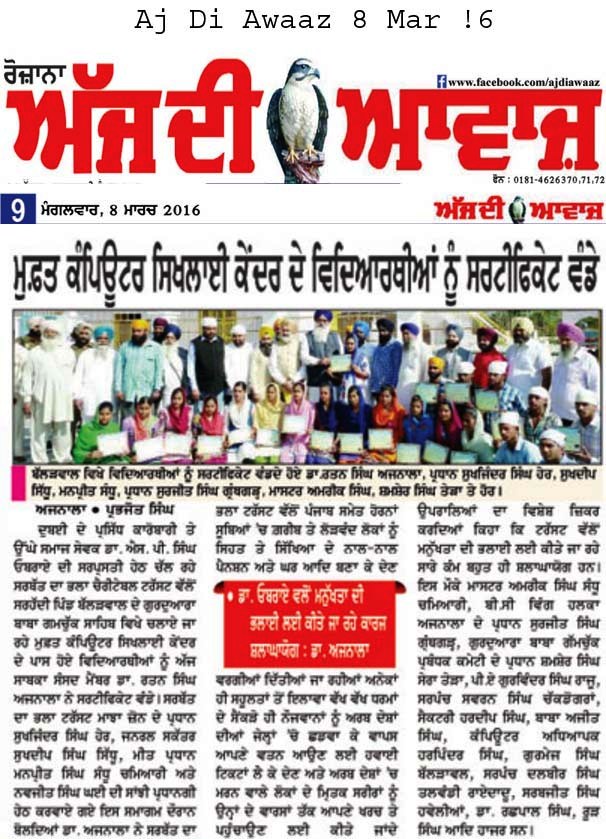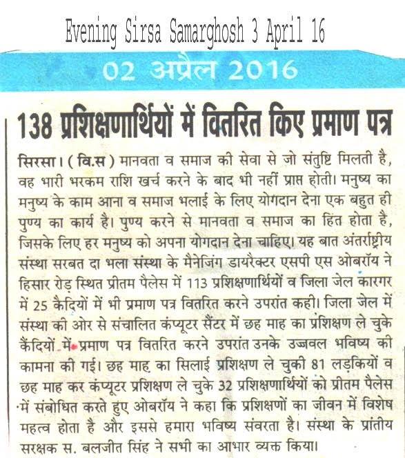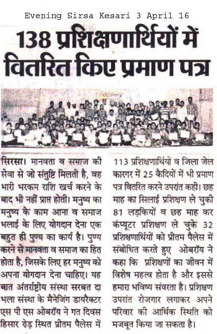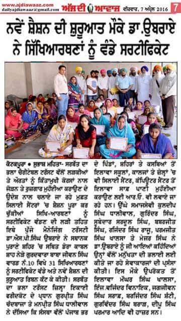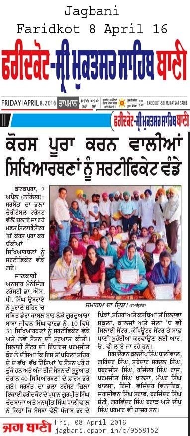 Sarbat Da Bhala Charitable Trust students of Computer Center & Sewing Center of Sirsa successfully completed their courses