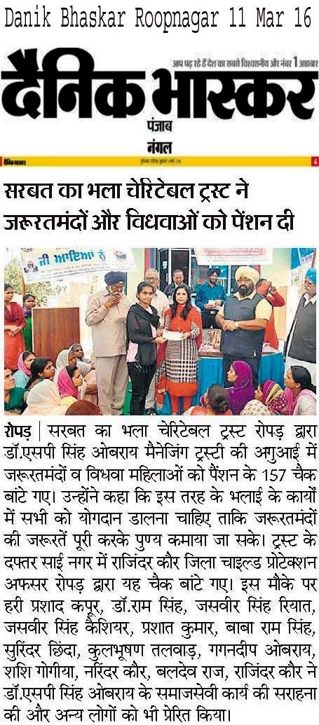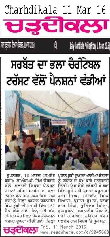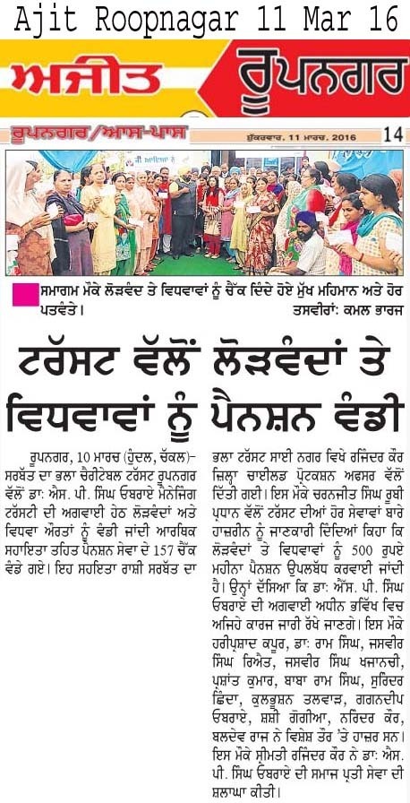 Sarbat Da Bhala Charitable Trust distributed monthly Widow cheques to 157 needy ladies of dist. Ropar