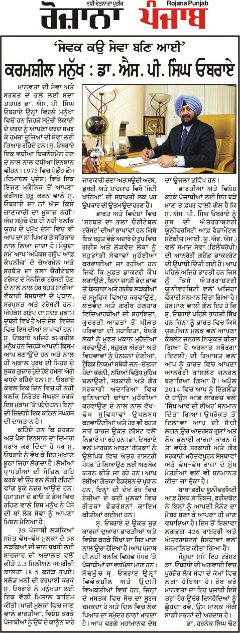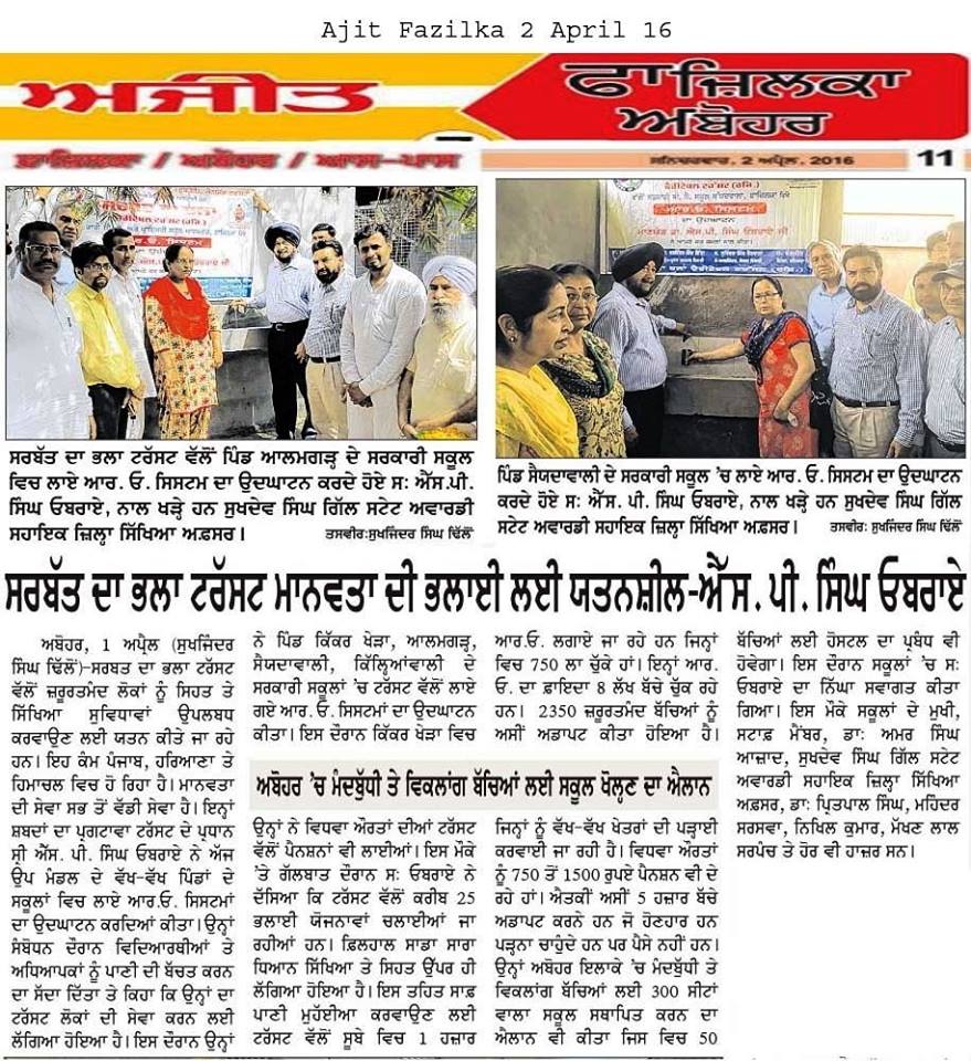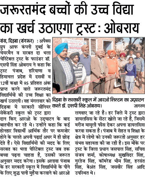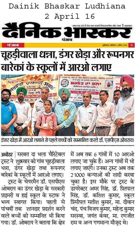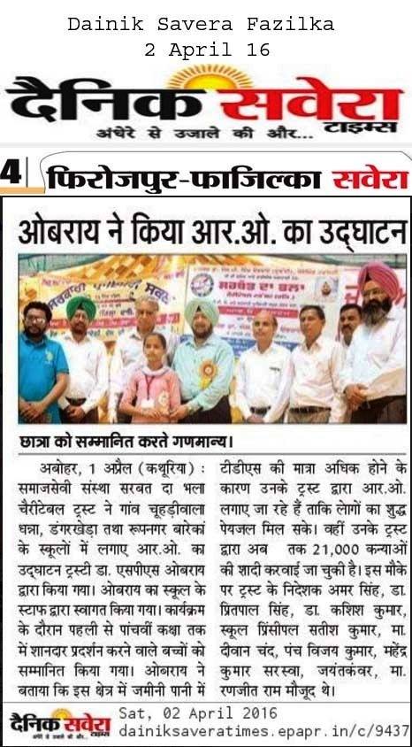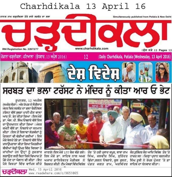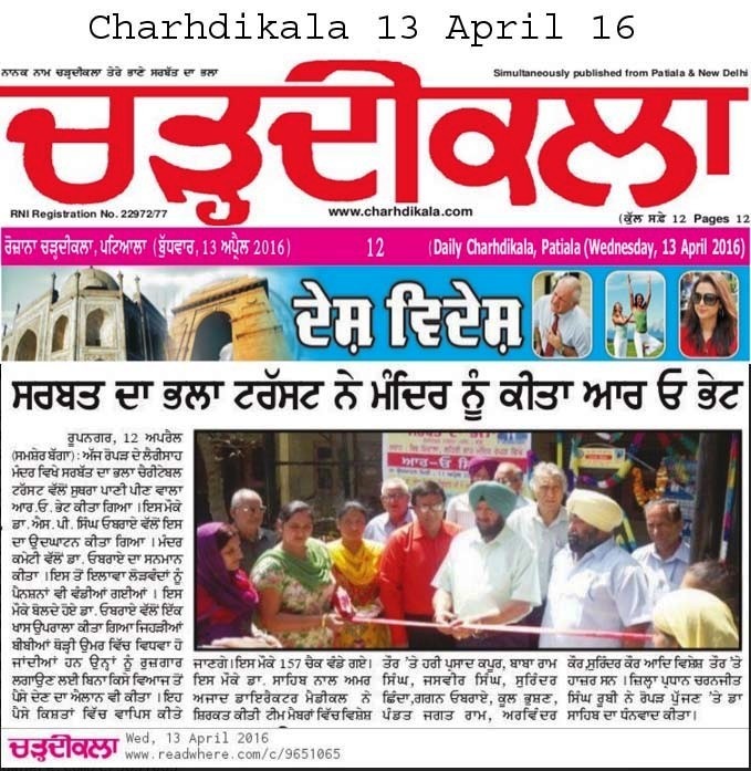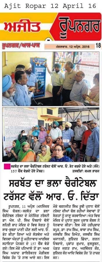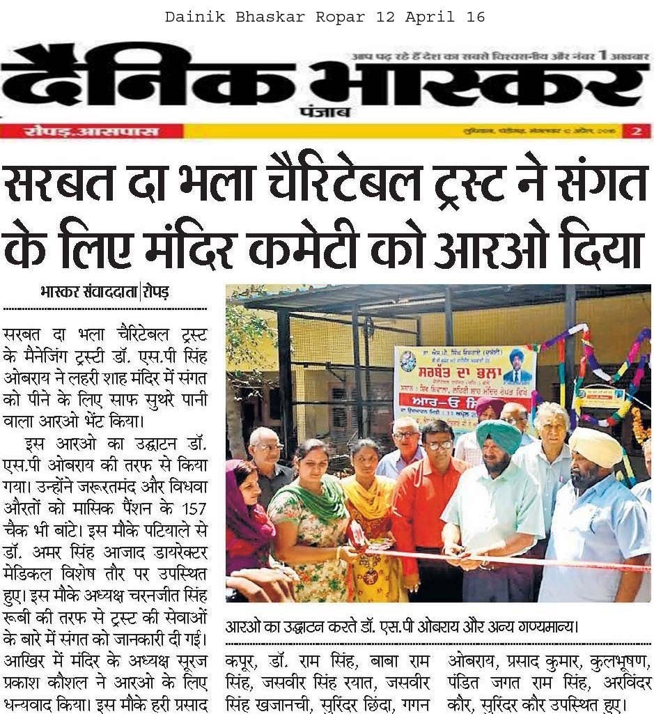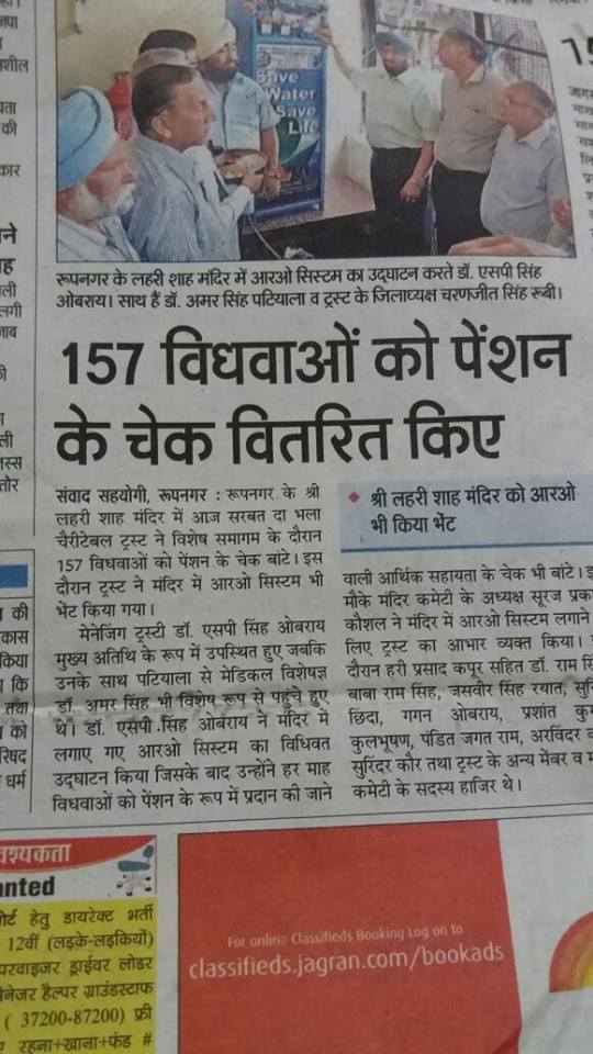 Sarbat Da Bhala Charitable Trust donated RO system in Lehri Shah Mandir Ropar. Dr S P Singh Oberoi inaugurated the RO system