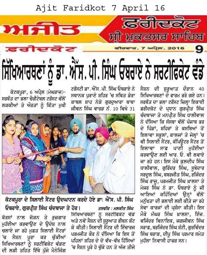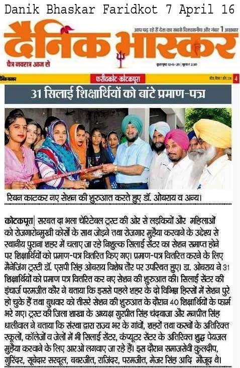 Dr S P Singh Oberoi Managing Trustee Sarbat Da Bhala Charitable Trust inaugurated one more Sewing Training Center at Gurudwara Guru Teg Bahadur Sahib , Kotkapura, Faridkot.