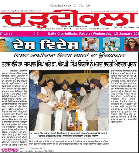 Dr S.P.Singh Oberoi honored by Mahan Bharti Award.