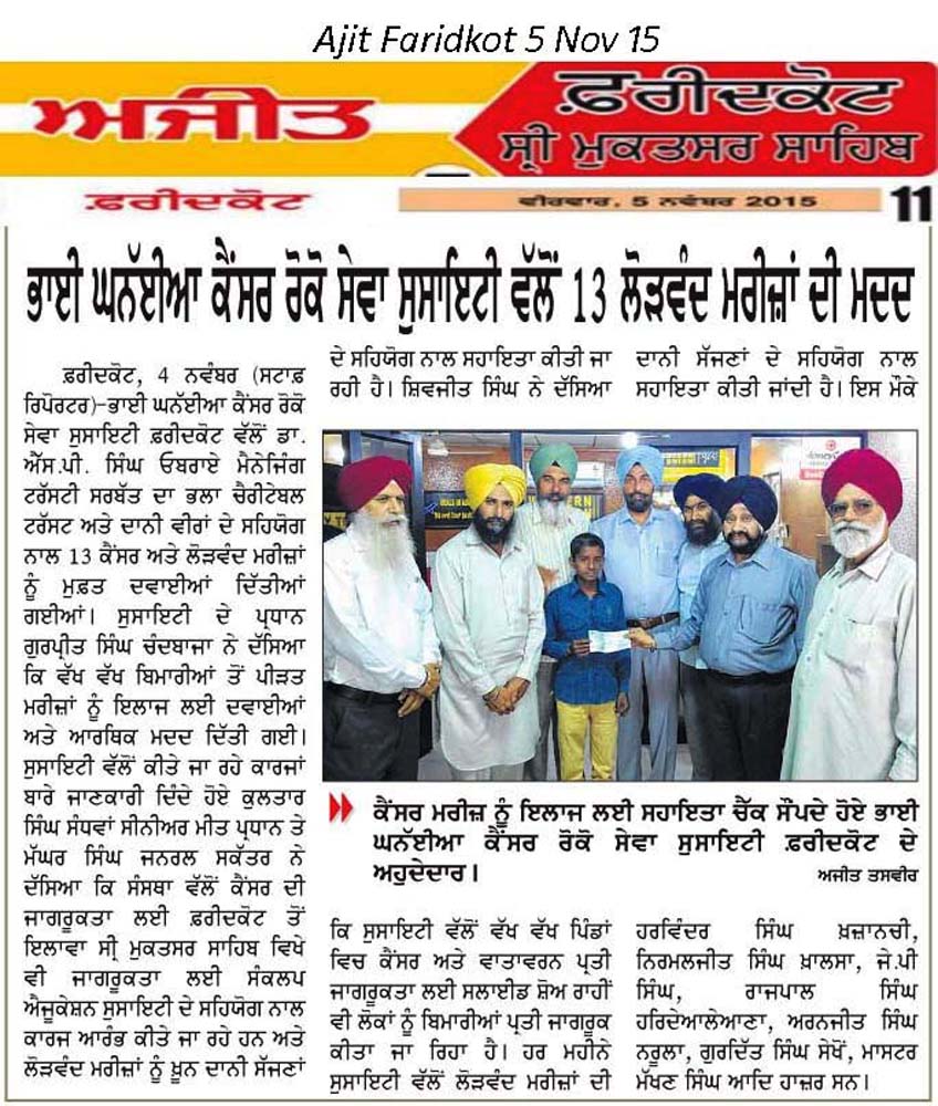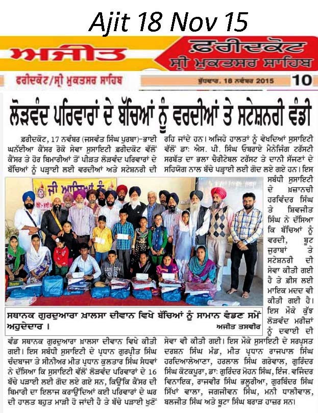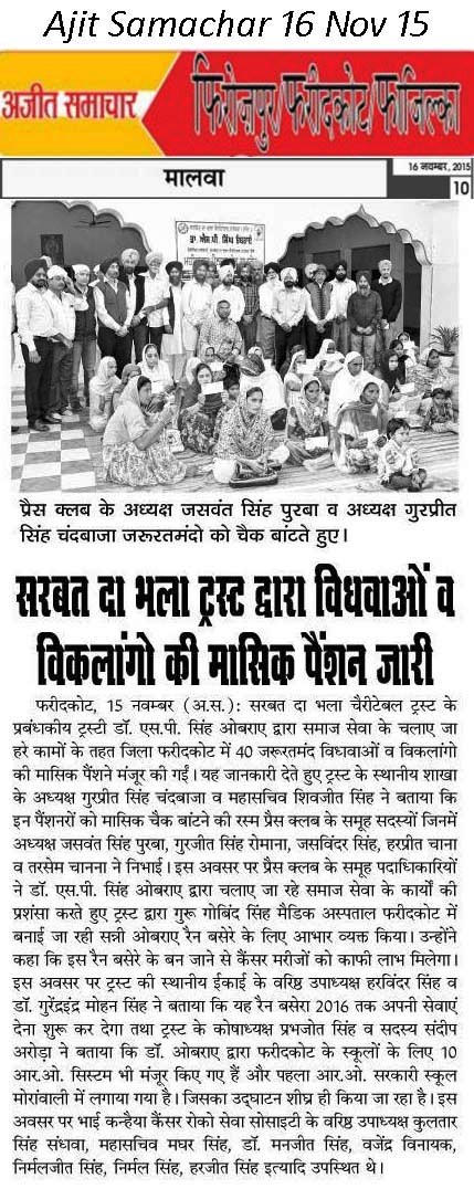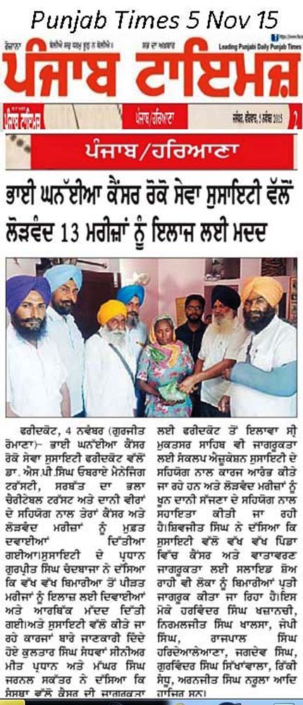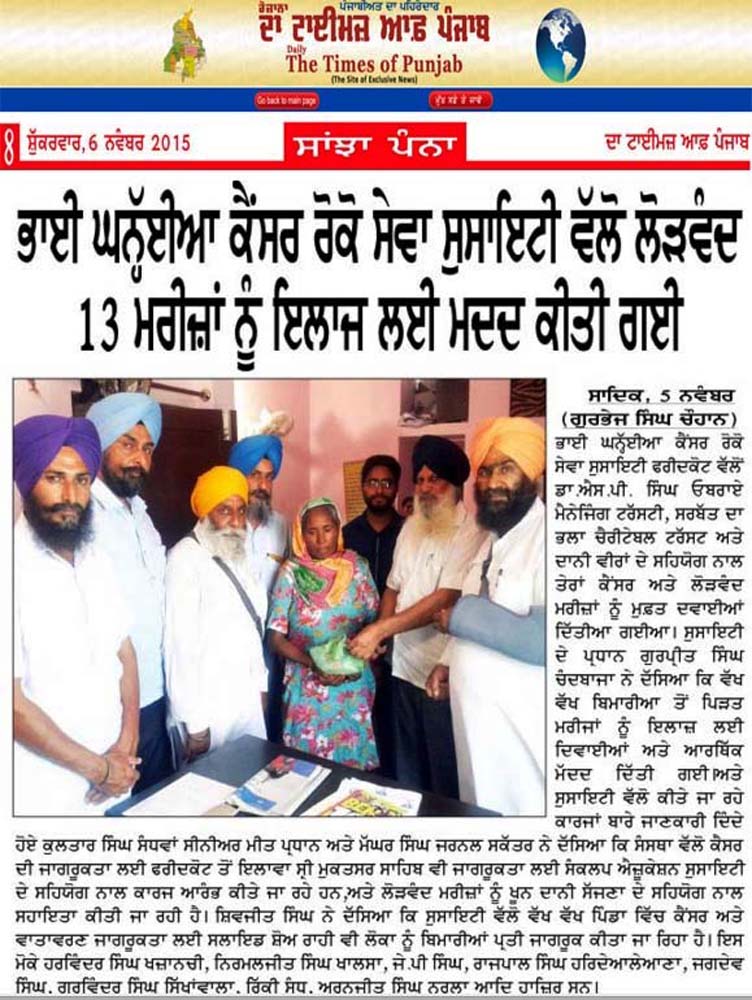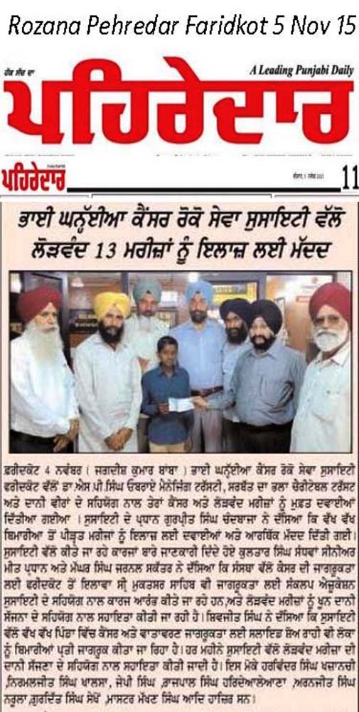 SDB Trust Providing financial help to 13 cancer Patients at Faridkot