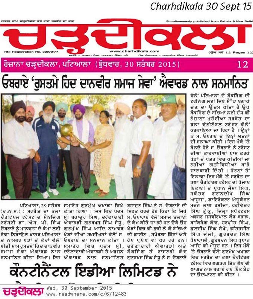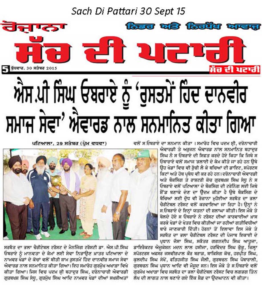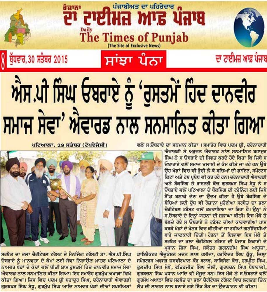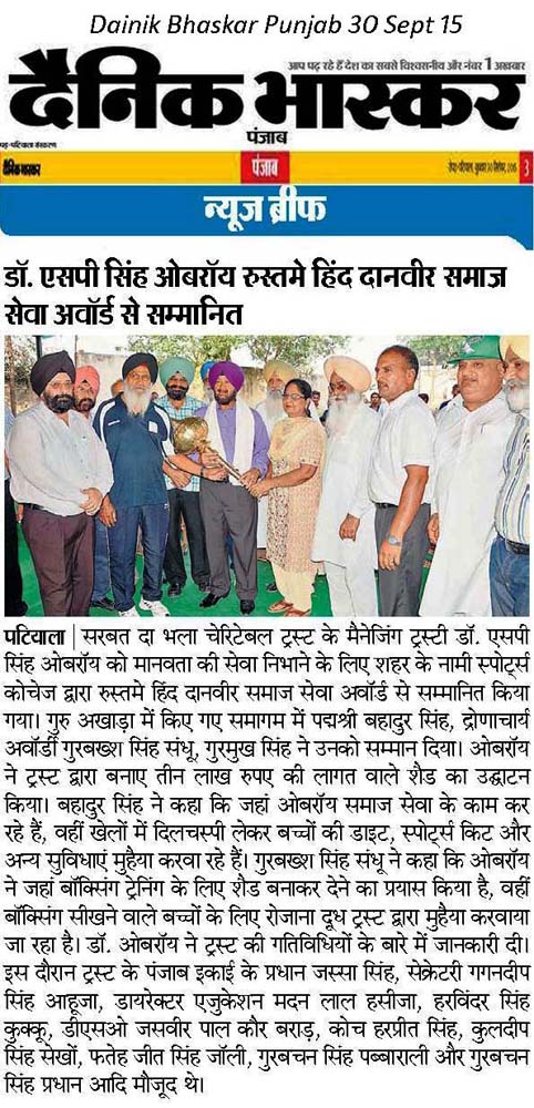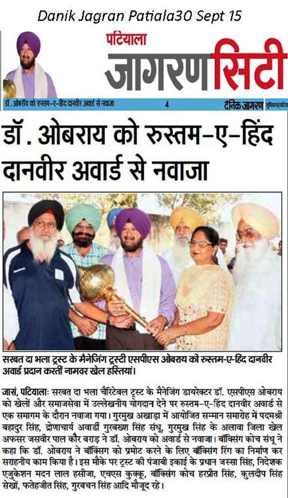 Rustm e Hind Daanveer Samaj Sewak Award given to Dr. SP Singh Oberoi