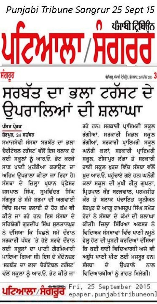 Sarbat Da Bhala Charitable Trust donated R.O. systems in various Government school