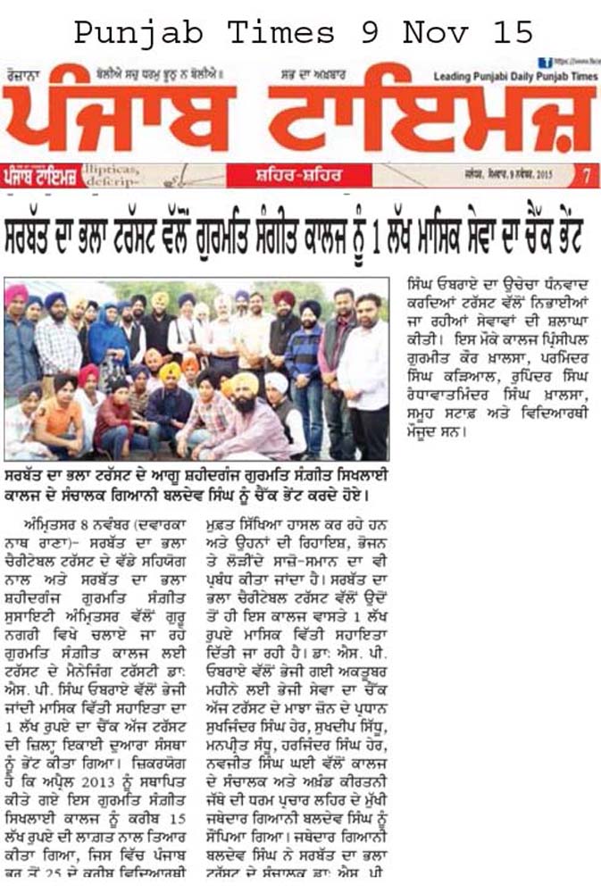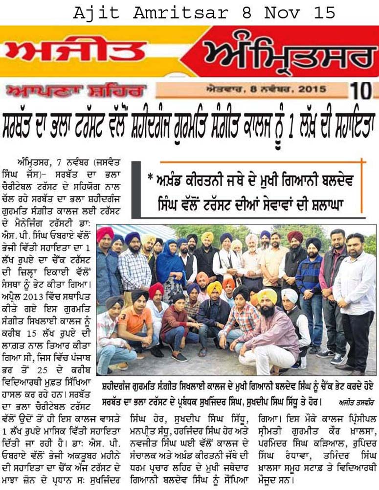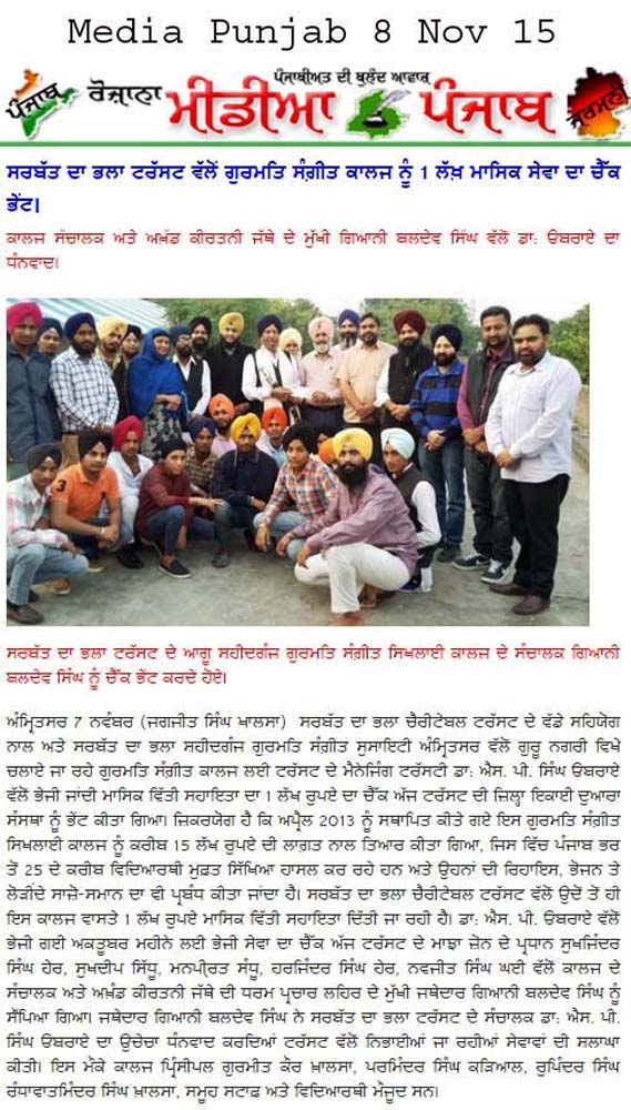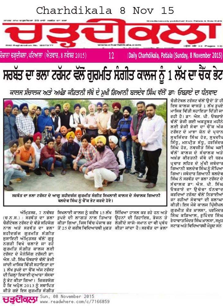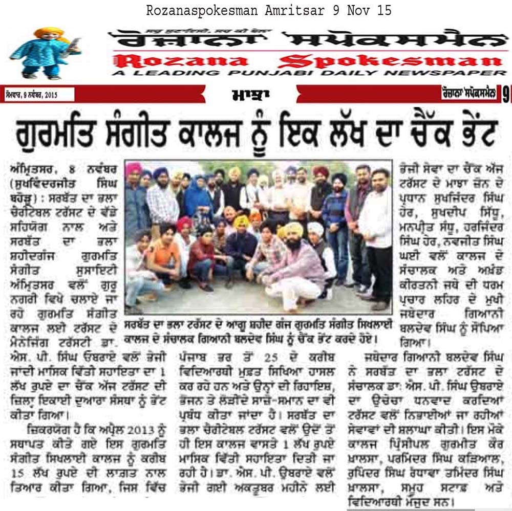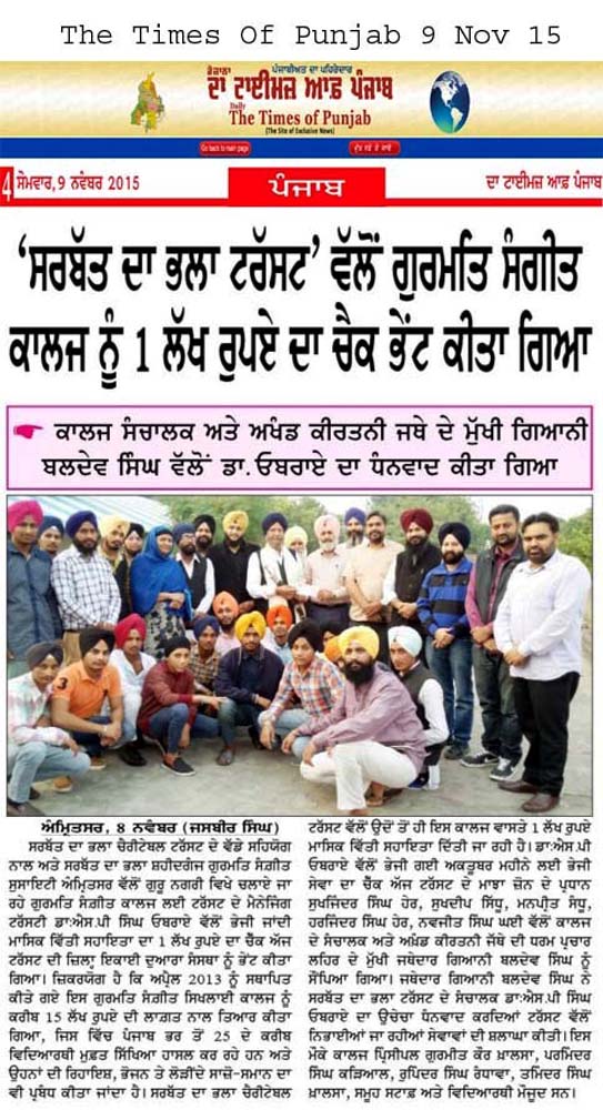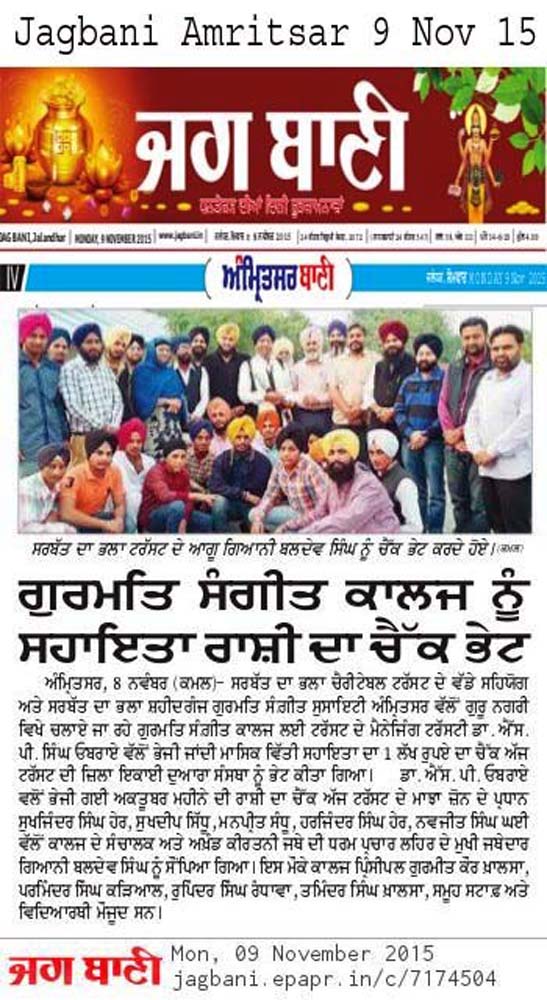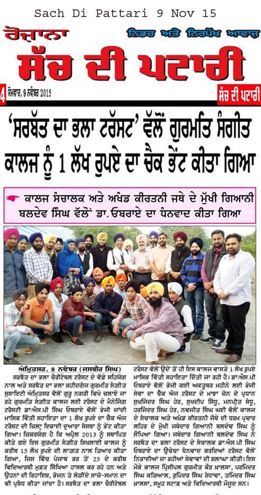 1 Lakh donated to Shaheed Gurmat Sangeet Collage Amritsar