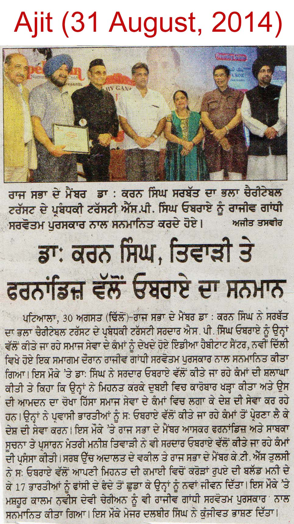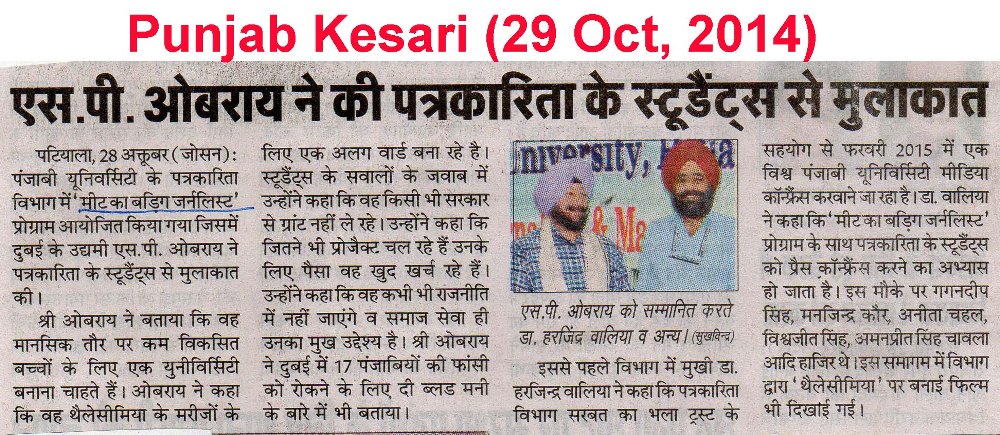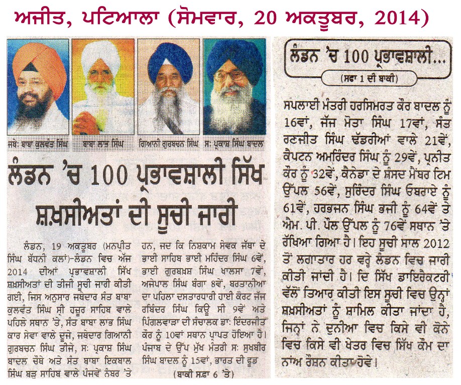 20 Oct, 2014 - S P S OBEROI Selected among 100 Sikhs of World