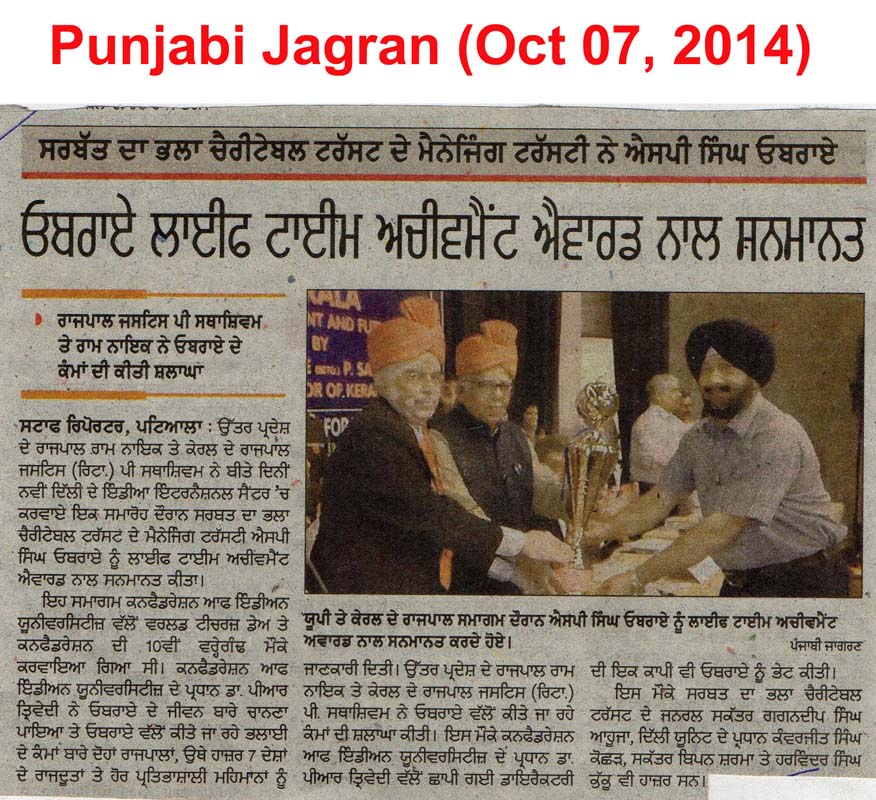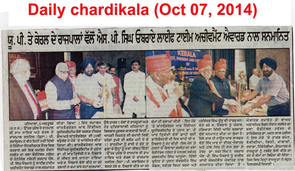 7 October, 2014, Life Time Achievement Award for Sh. S.P. Singh Oberoi from Governers of Kerala & U.P
