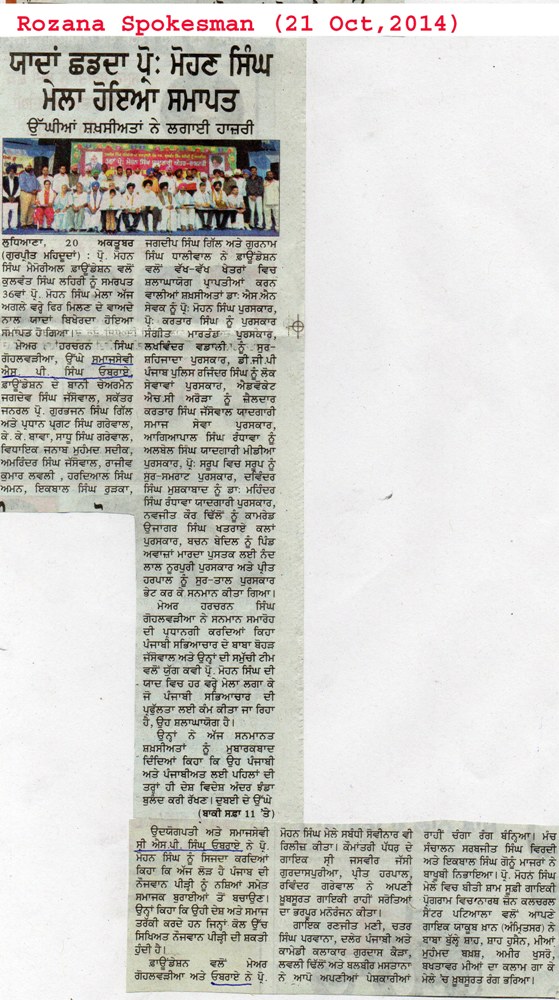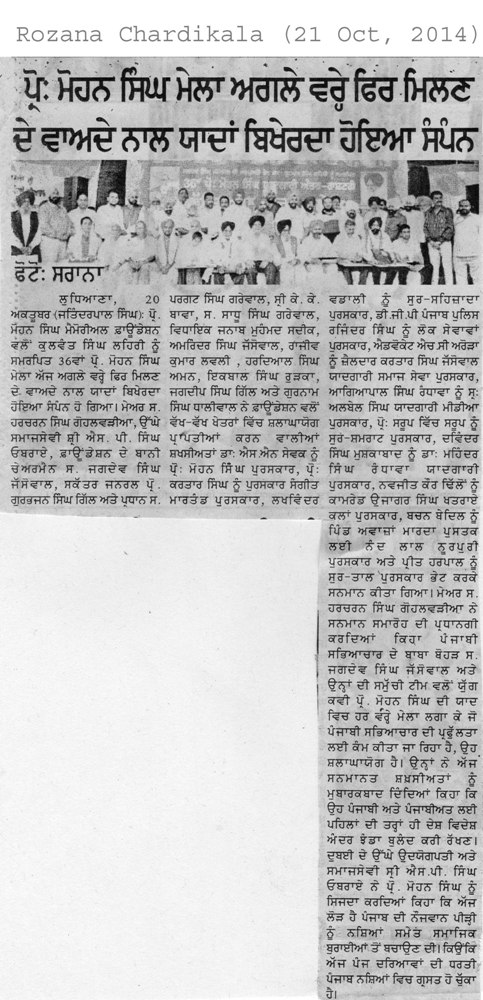 21 Oct, 2014,Honour by Prof. Mohan Singh foundation Ludhiana