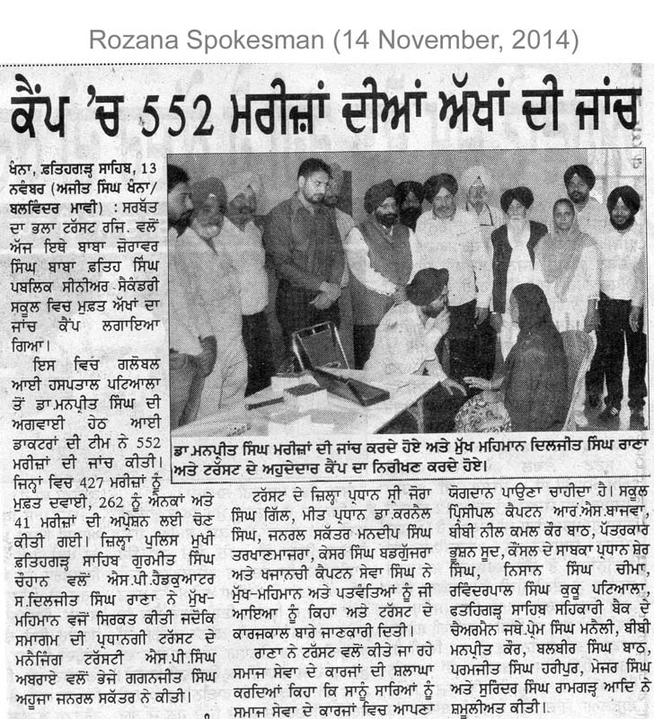 14 Nov 2014 - 552 Persons examined at Fatehgarh Sahib Eye Camp