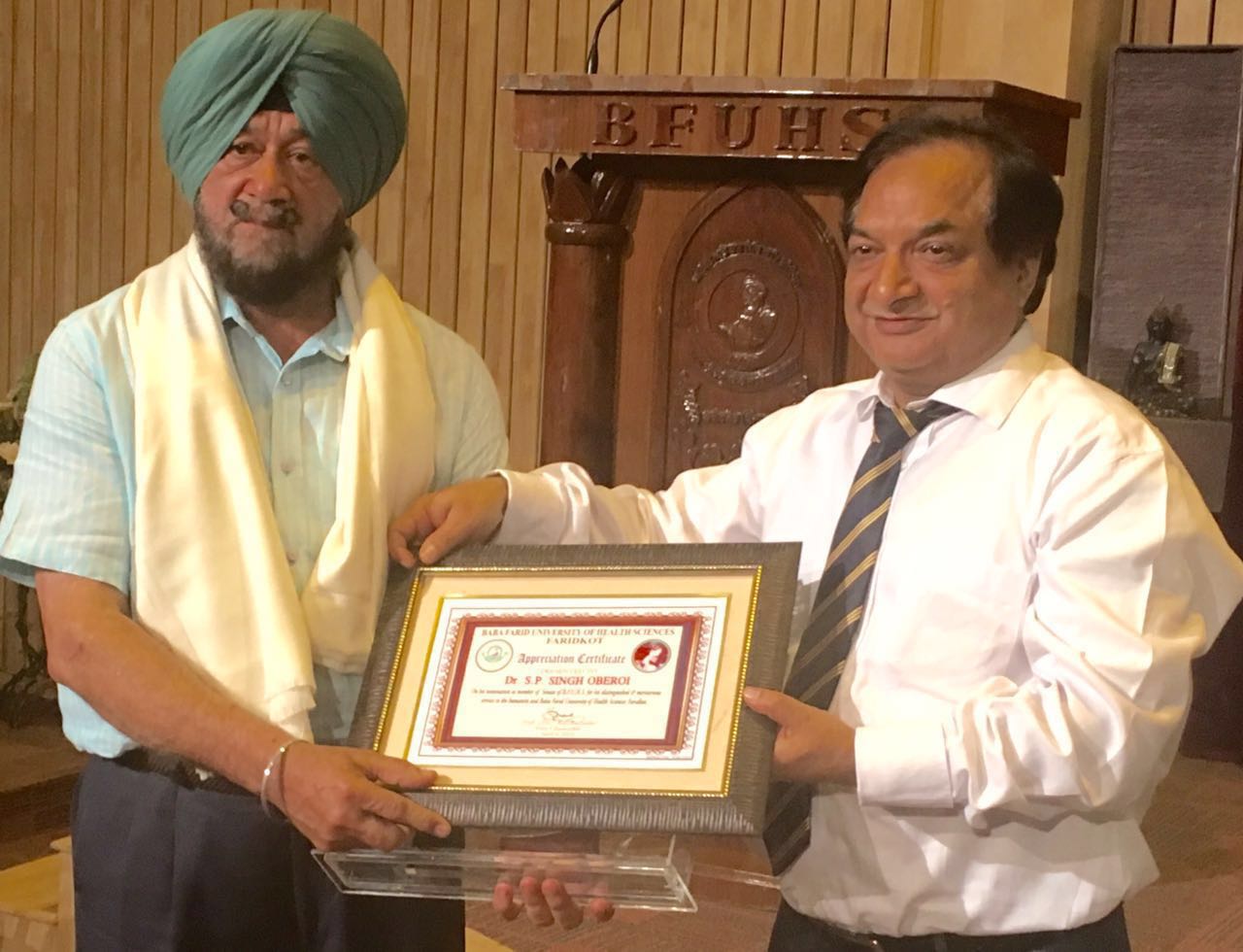 Dr S P Singh Oberoi honoured & nominated as member of Senate of Baba Farid University of Health Sciences Faridkot. In the Presence of all Senate Members of BFUHS VC Dr Raj Bahadur Ji honoured him with Certificate & trophy.