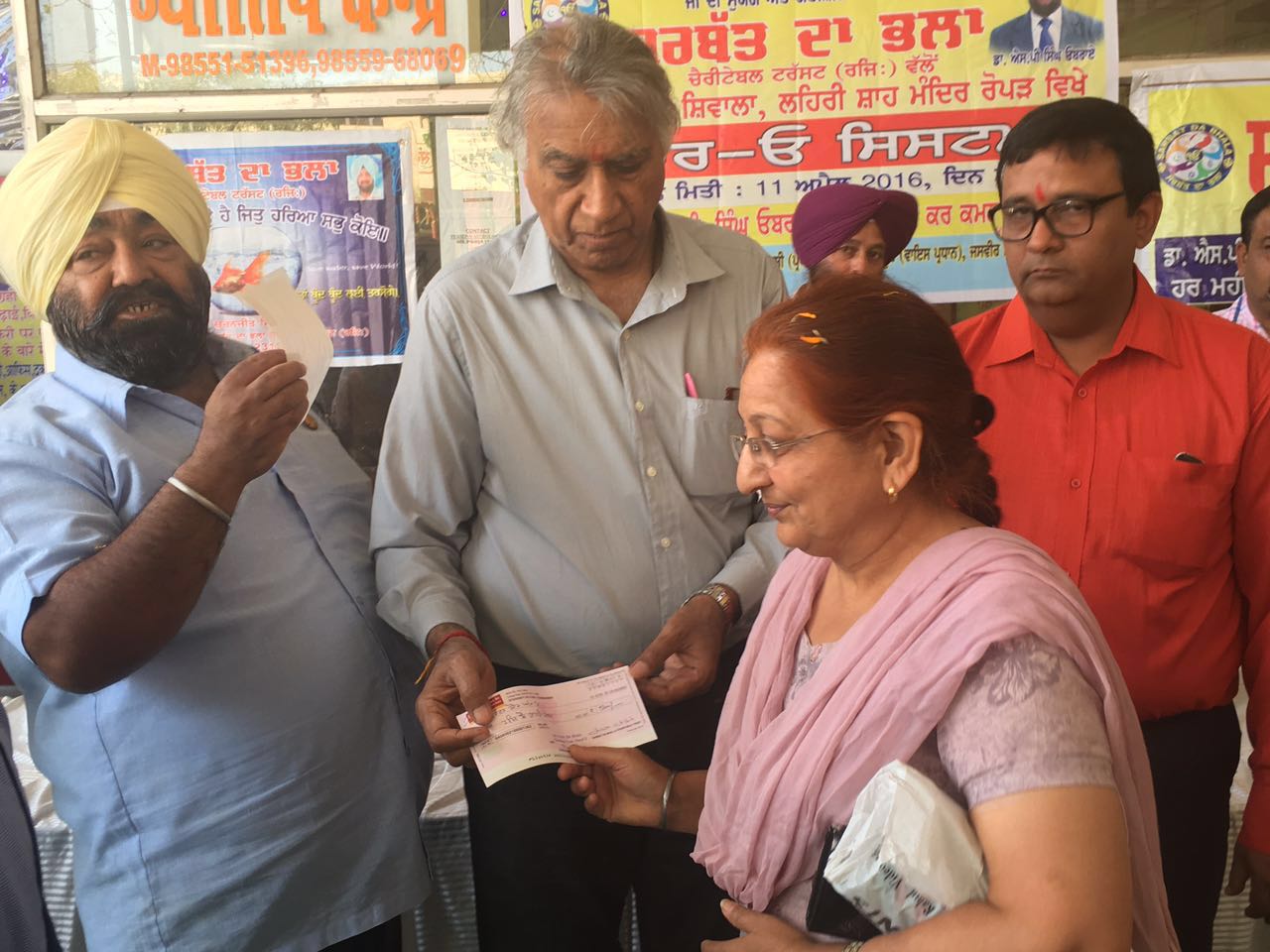 Dr S P Singh Oberoi handed over the cheques to widow needy ladies of Bathinda. SDB Bathinda President Dr Kashish Gupta was also present along with his team
