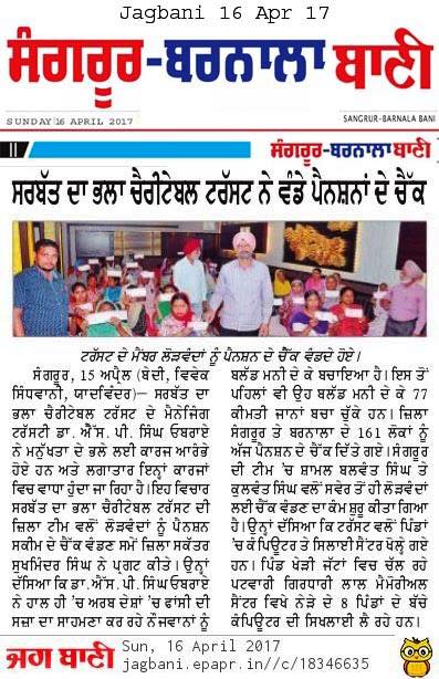Under the able guidance and leadership of Respected Prof. Dr. S.P Singh Oberoi Sarbat da Bhala Charitable Trust team members of district Sangrur handed over the monthly pensions to 160 Widows and needy ladi