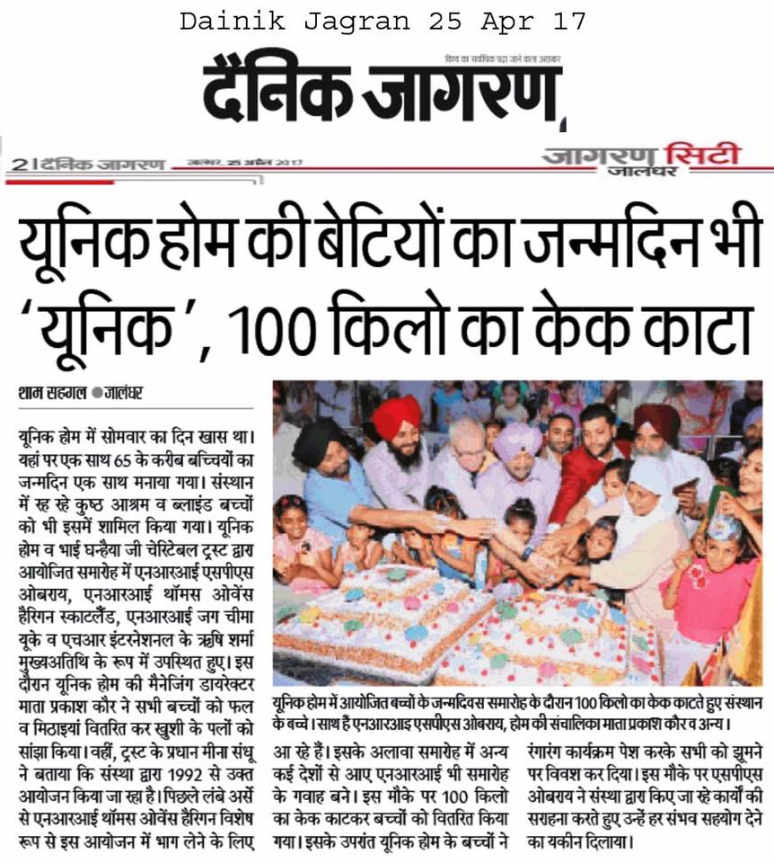 As a Chief Guest Prof ( Dr) S P Singh Oberoi Ji attended Annual Birthday Celebration at Unique Home for Abandoned Girls Jalandhar