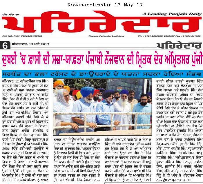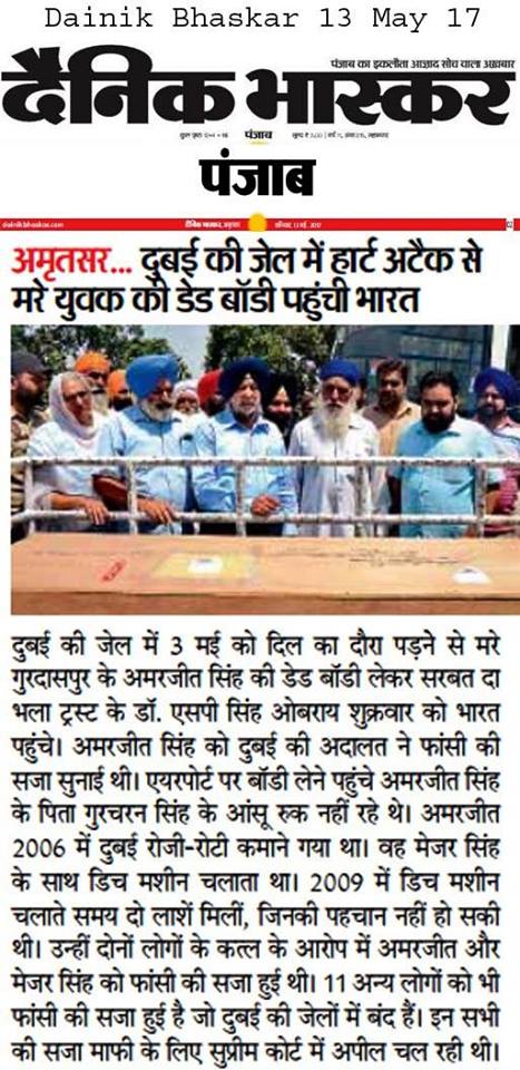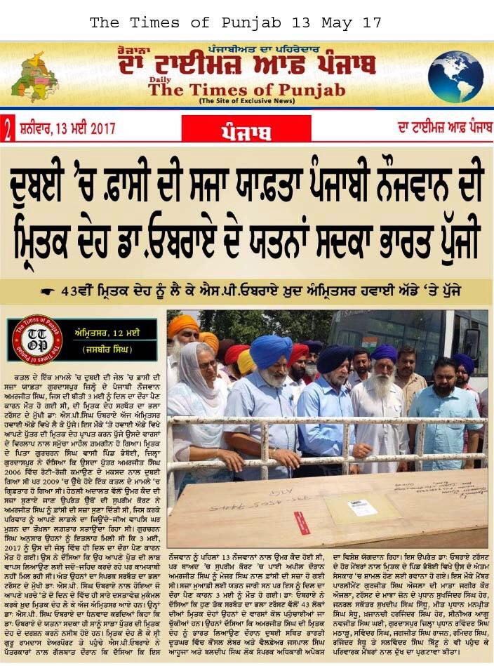 Prof (Dr) S.P.Singh Oberoi brings back the body of Punjab youth who died in Dubai jail