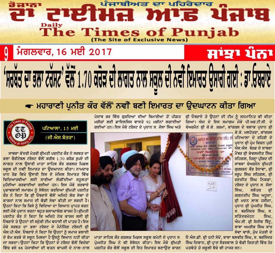 Sarbat da Bhala Charitable Trust constructed the new building of Mata Sahib Kaur Girls School Patiala, Gurdwara Sahib & Sunny Oberoi Academic Block at a cost of Rs 1.75 crore
