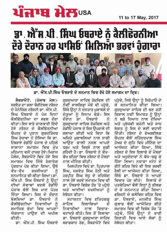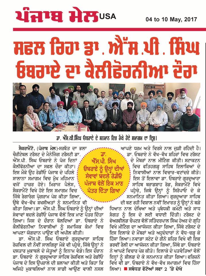 Prof ( Dr) S P Singh Oberoi Ji Honored at Bay Area by Dr Pritpal Singh