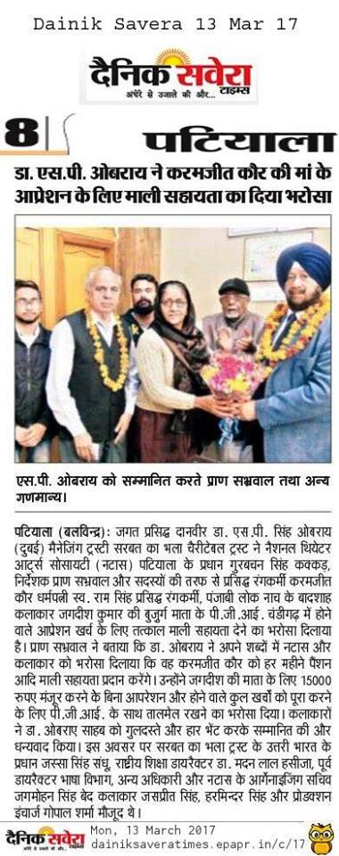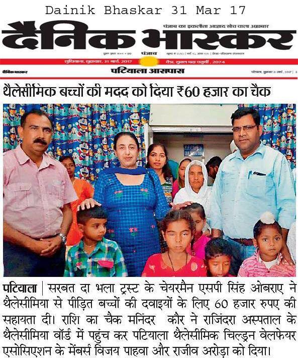 Sarbat da Bhala Charitable Trust is providing monthly support to Rajendra Hospital Patiala for the treatment of needy child suffering from Thalassemia. Mrs Oberoi handed over the cheque to the Hospital authorities