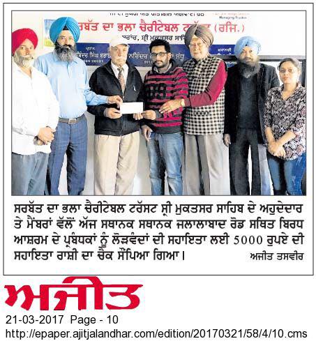Under the able guidance of Dr. S.P Singh Oberoi Ji Sarbat da Bhala Charitable Trust team members of Shri Muktsar Sahib hand over the cheque of monthly support to Old Age Home