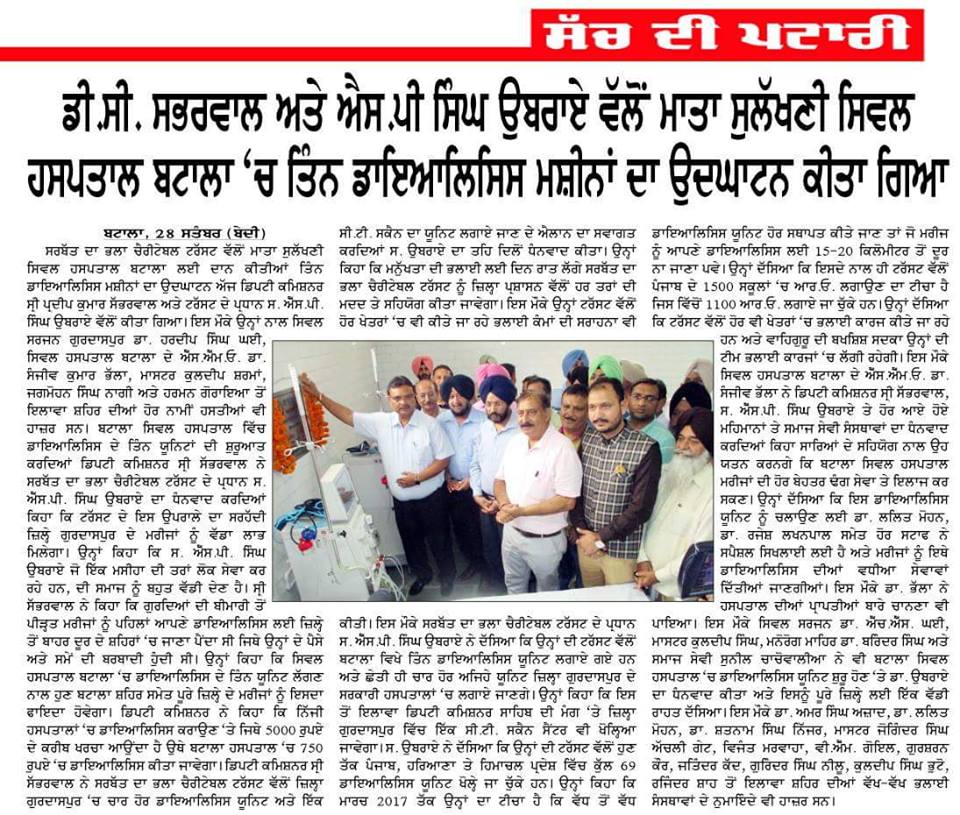 Sarbat Da Bhala Charitable Trust donated 3 Dialysis Units at Civil Hospital