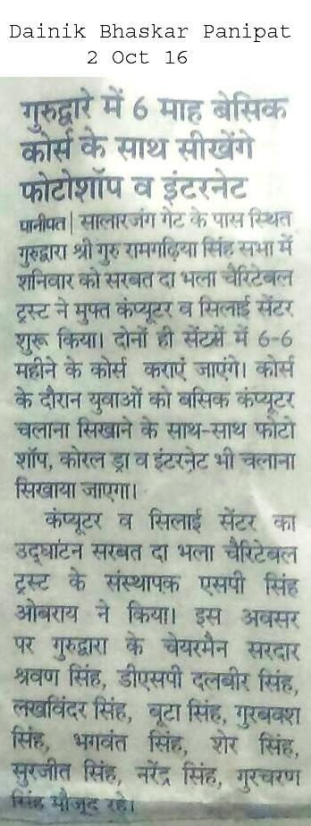 Sarbat Da Bhala Charitable Trust Opened Computer center & Sewing Center at Gurudwara Ramgarhia Singh Sabha at Salarganj Panipat state Haryana