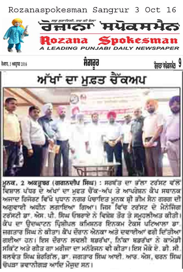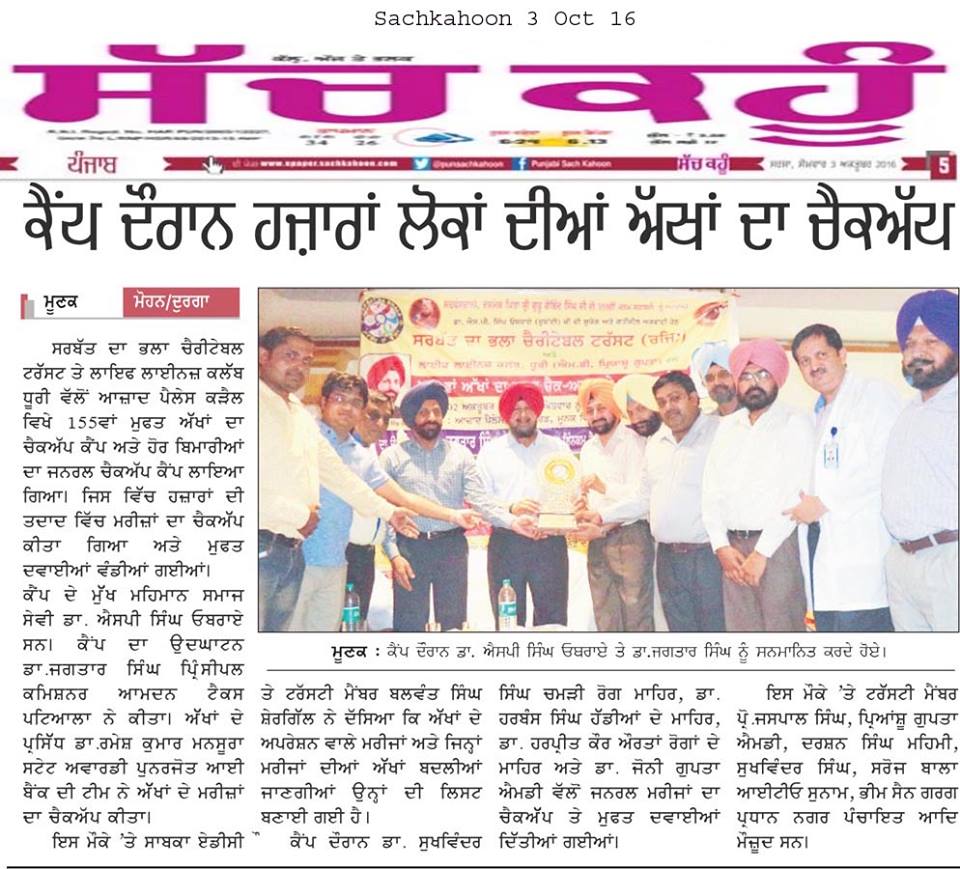 Sarbat da Bhala charitable trust organized 155th free eye checkup, cataract surgery and cornea transplantation camp at Azad palace, Moonak,Sangrur. Eye camp was inaugrated by Dr. Jagtar Singh( Principal Income tax commissioner). & Dr. SP Singh Oberoi