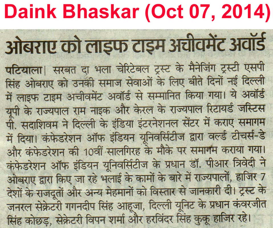 20 Oct, 2014 - S P S OBEROI Selected among 100 Sikhs of World