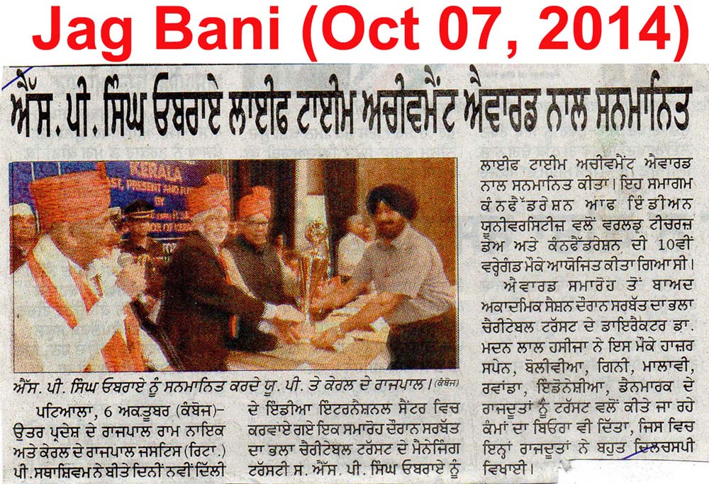 7 October, 2014, Life Time Achievement Award for Sh. S.P. Singh Oberoi from Governers of Kerala & U.P