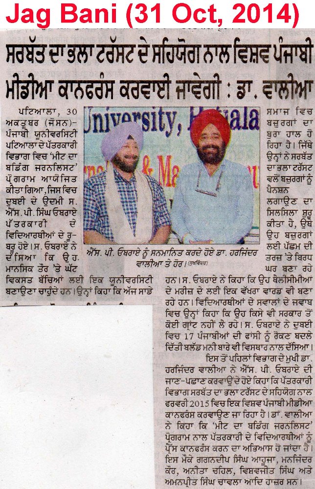 31 Oct, 2014,Dr. Harjinder Walia Honoured Sh. S.P.Singh Oberoi at Punjabi University