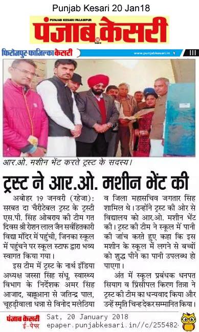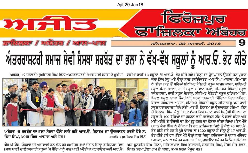 Sarbat da Bhala Charitable Trust donated RO System at Govt Girls School at village Dhrangwala district Fazilka