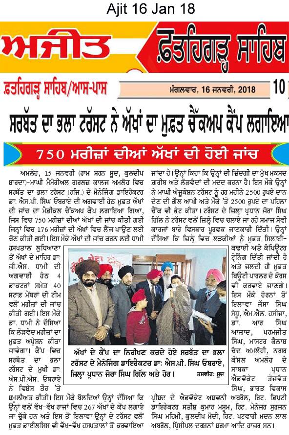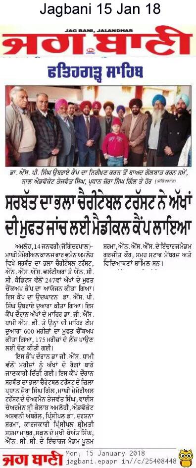 Sarbat da Bhala Charitable Trust organized 247 th Free Eye check up camp at Maggi Memorial College Amloh dist Fatehgarh Sahib