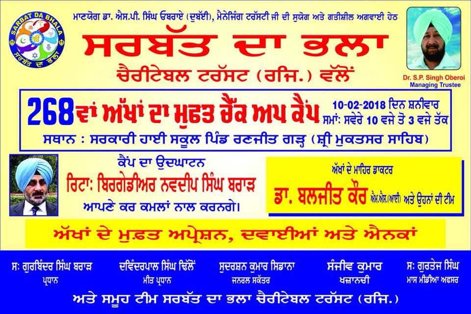 Sarbat da Bhala Charitable Trust organized free 268 Eye Check up camp at Govt High School village Ranjitgarh