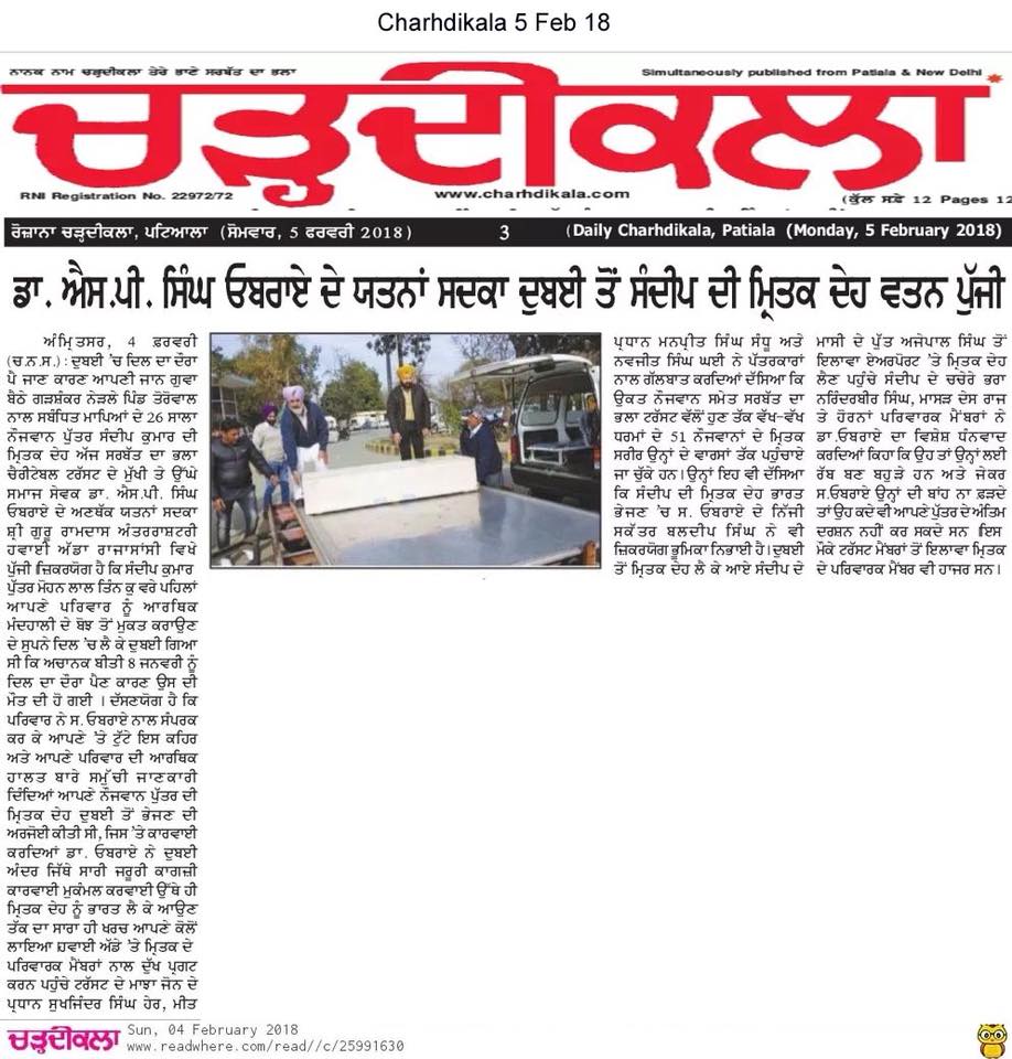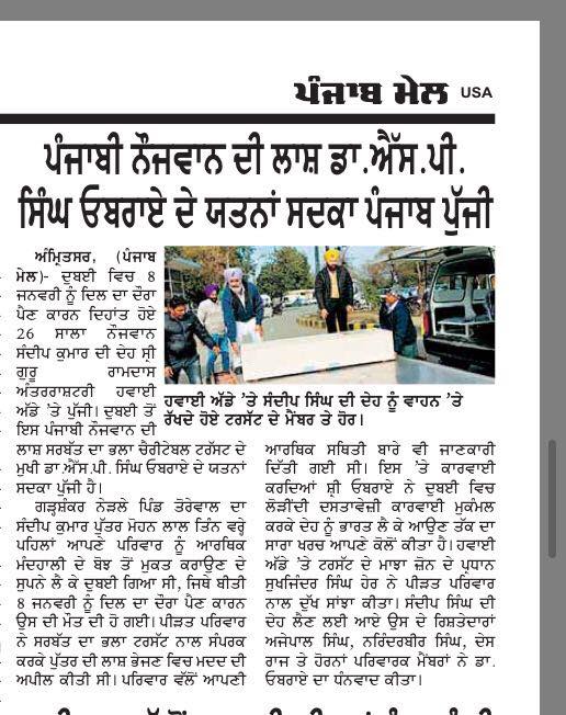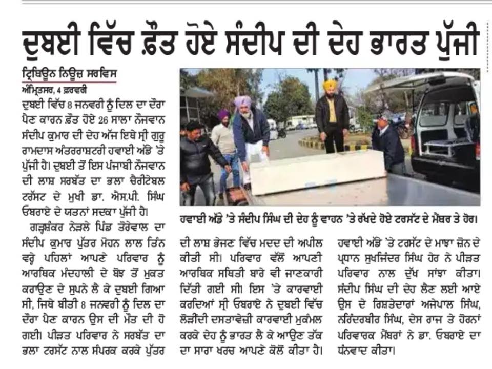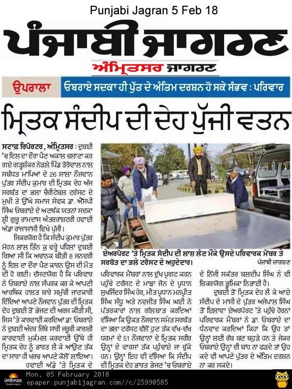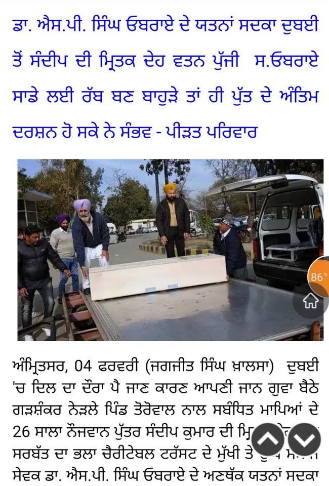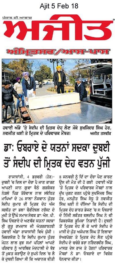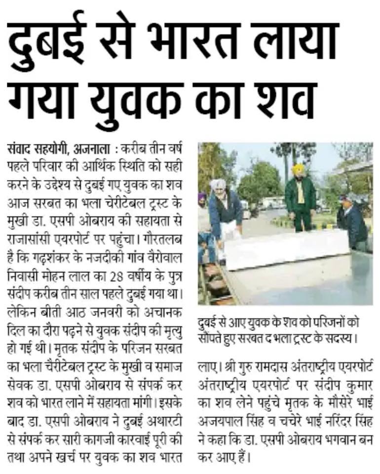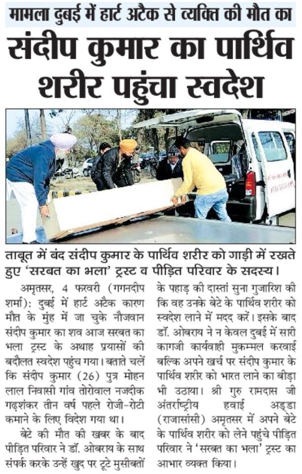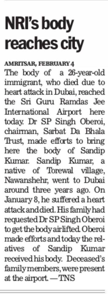 Body of Mr. Sandeep Kumar arrives from Dubai with the help of Prof.(Dr.) S.P. Singh Oberoi