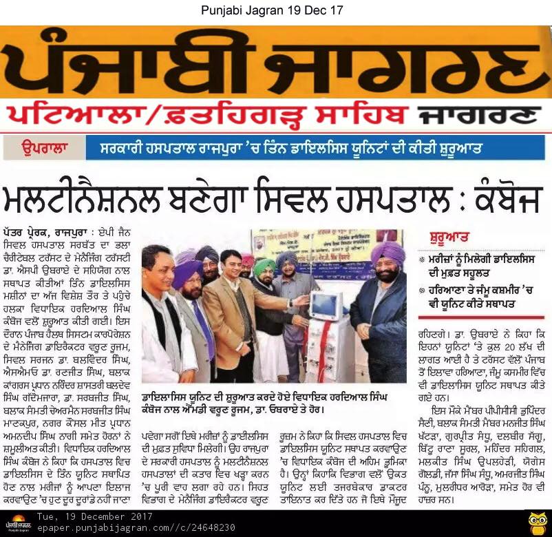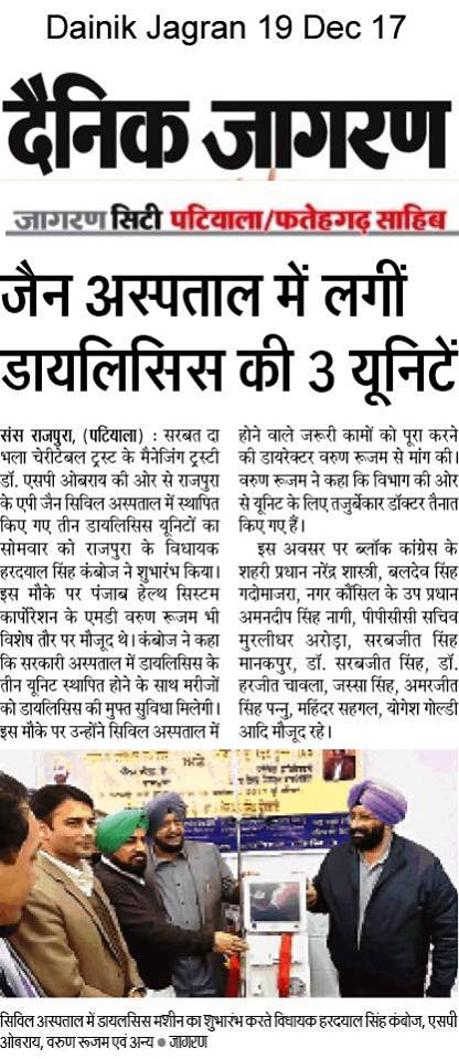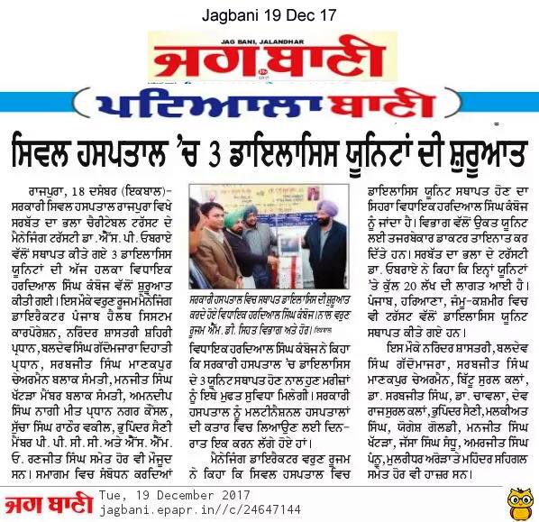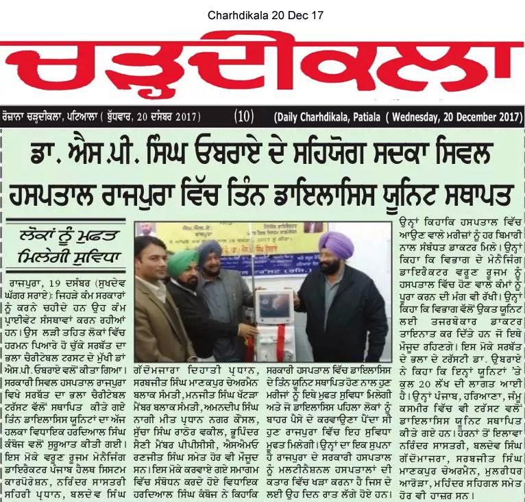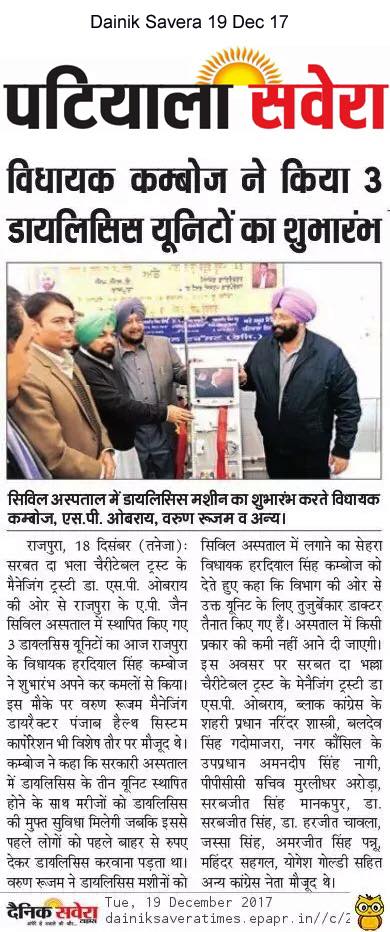 Sarbat da Bhala Charitable Trust opened Sunny Oberoi Dialysis Center with 3 Dialysis units at Civil Hospital Rajpura
