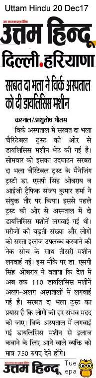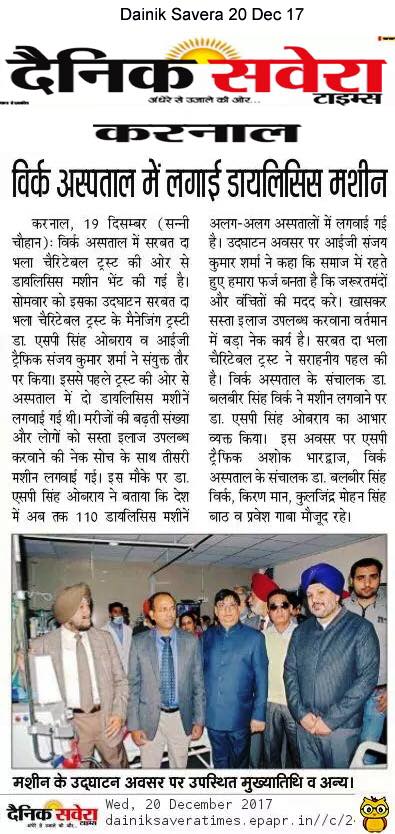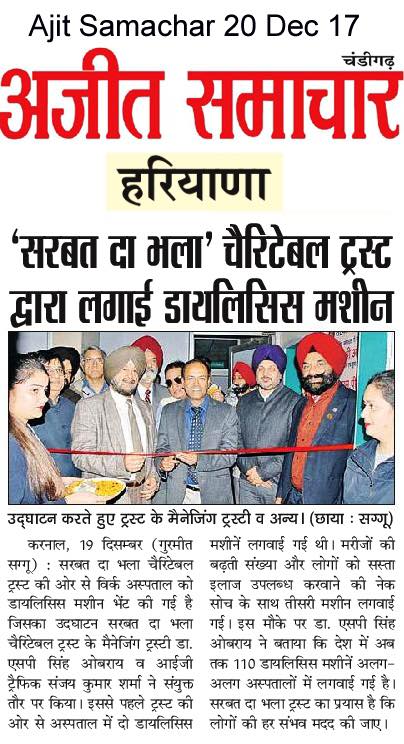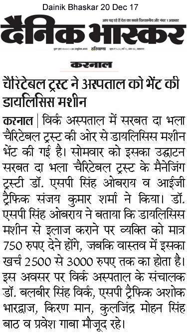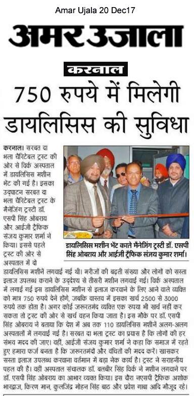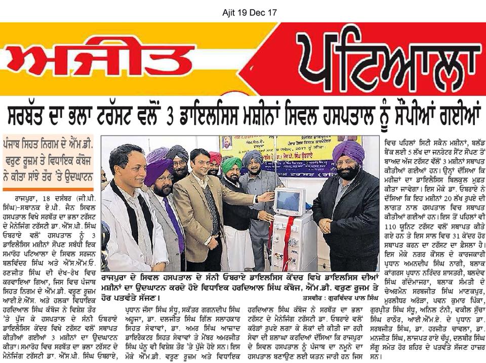 Sarbat da Bhala Charitable Trust donated 3 rd Dialysis Unit at Virk Hospital